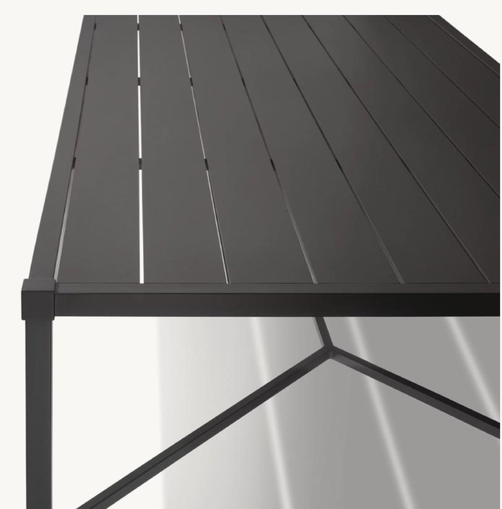 The Tisdale 8-Seater Rectangle Dining Table brings timeless elegance to outdoor entertaining. Its classic slatted top and slender tapered legs are complemented by an X-braced stretcher for added stability and refined detail. Crafted from powder-coated aluminum, this table balances durability with graceful design—ideal for gatherings that demand both style and function.