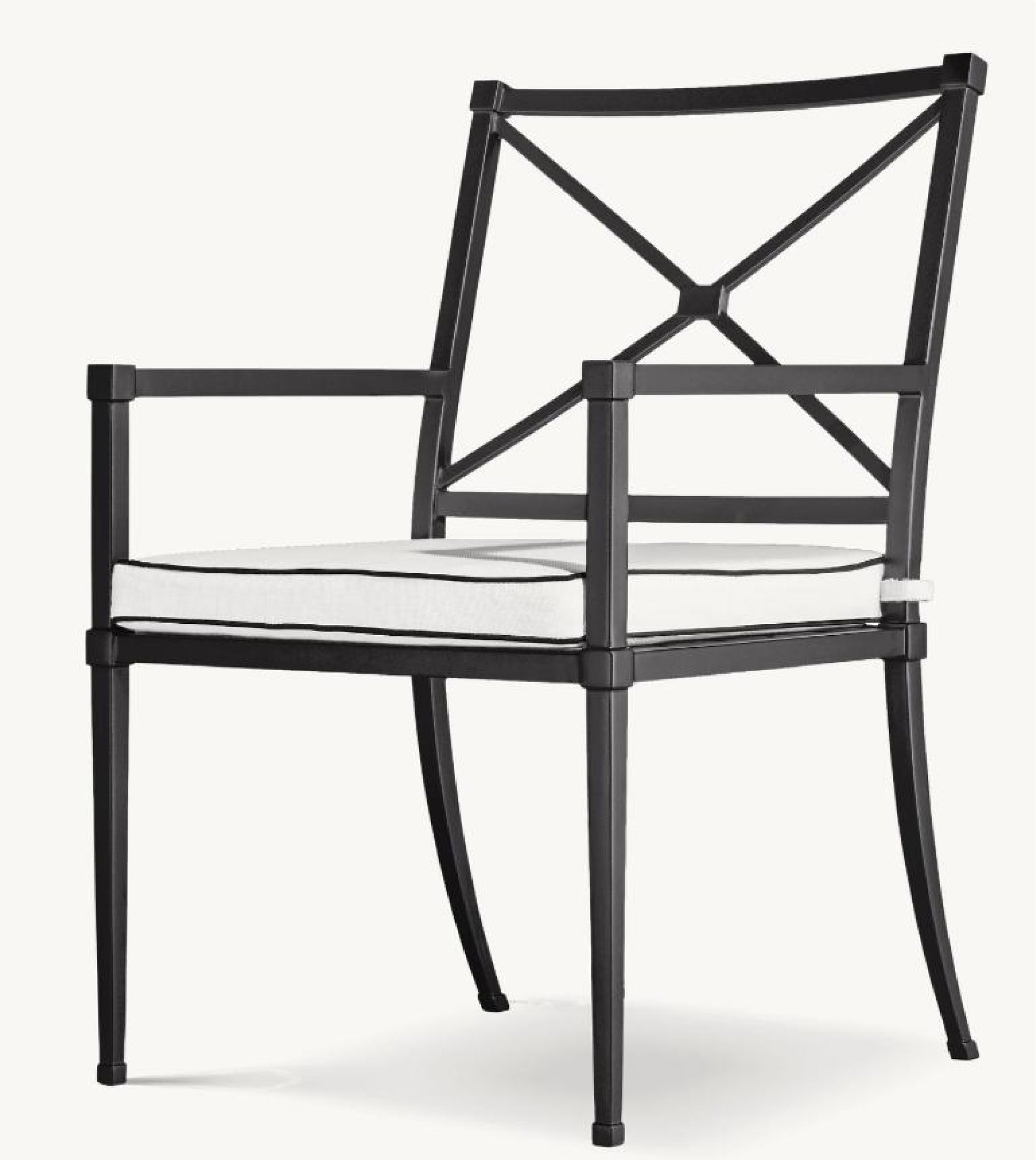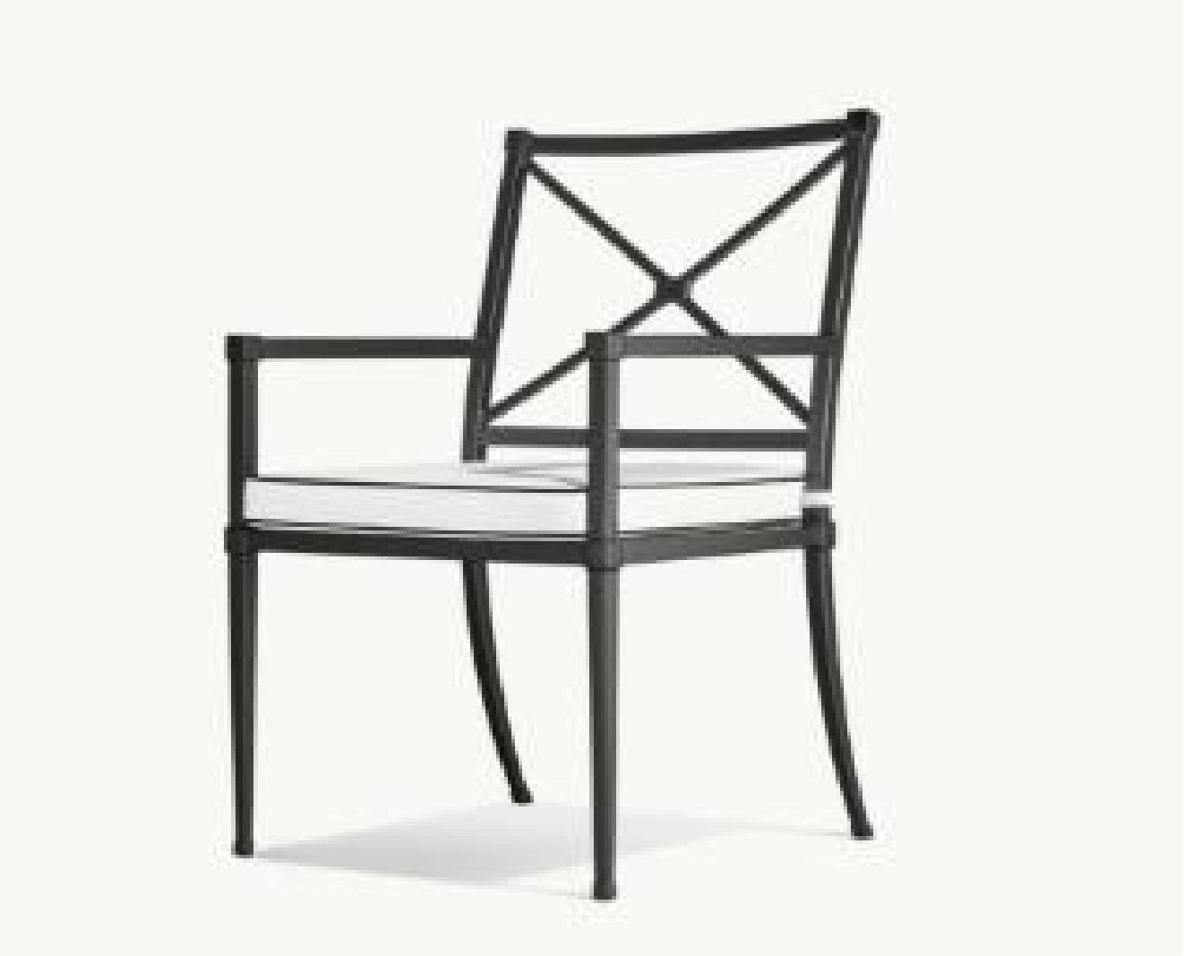 The Tisdale Arm Dining Chair brings refined detail to outdoor dining with its elegant X-back design and gracefully tapered legs. Crafted from powder-coated aluminum, it balances classic proportions with modern durability. A tailored seat cushion adds comfort to the structured silhouette, making it ideal for formal meals or relaxed gatherings alike.