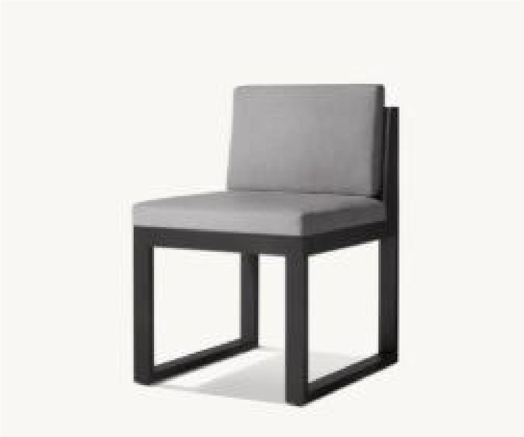 The Casablanca Armless Dining Chair offers a sleek, minimalist design with its powder-coated aluminum frame and cushioned seat and backrest in a neutral tone. Its streamlined form ensures comfort and style for extended outdoor dining occasions.