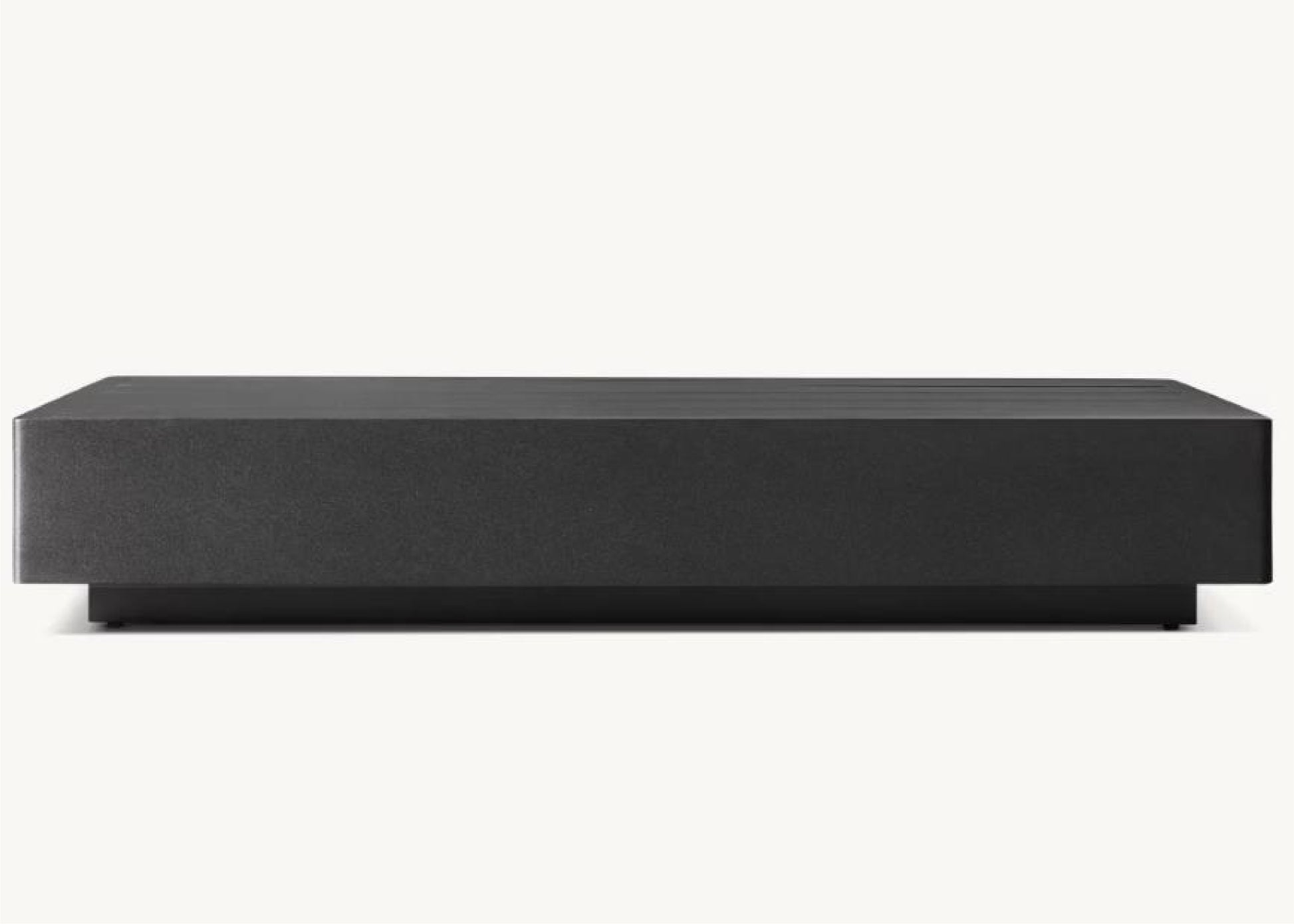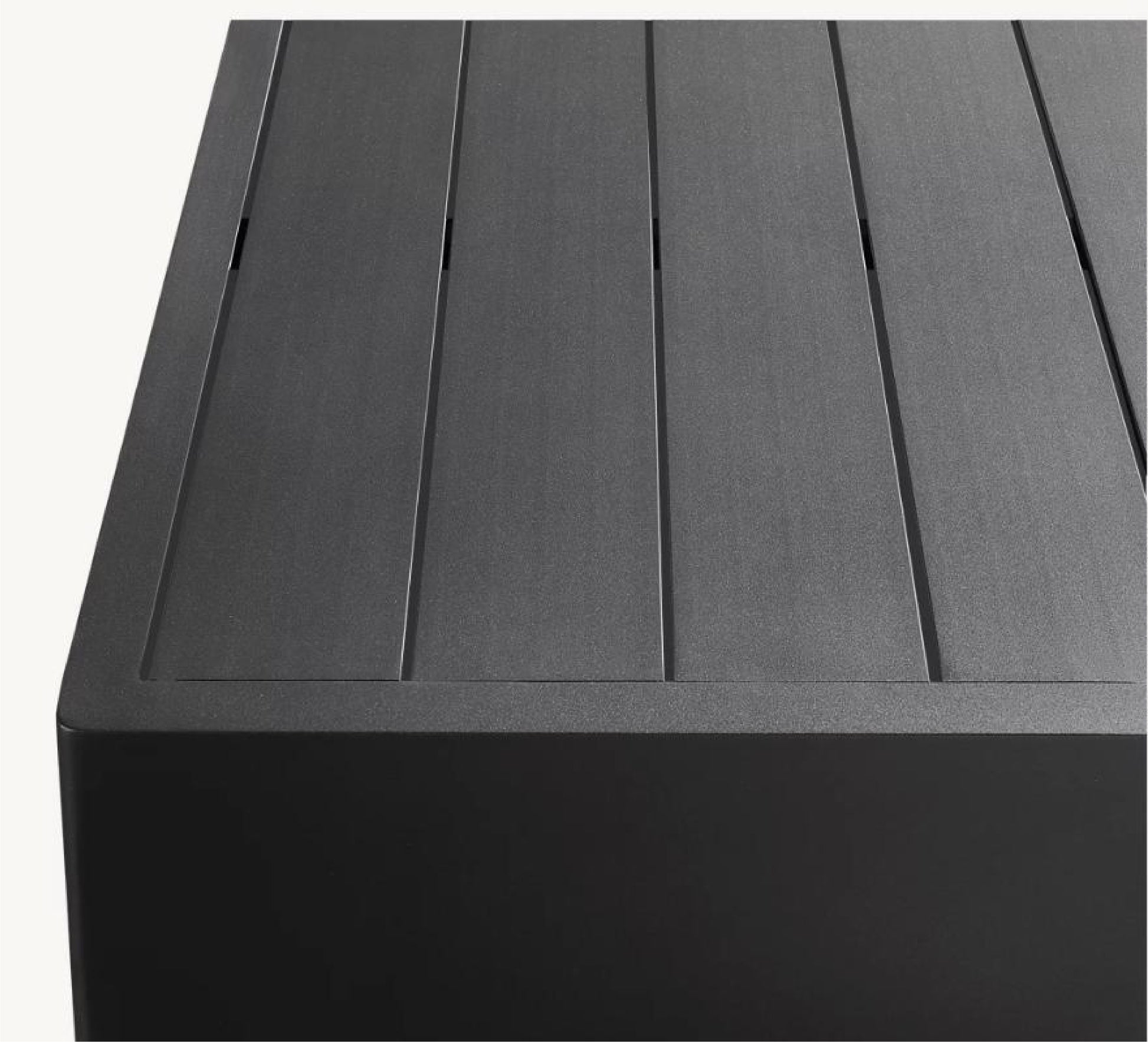 The Mia Coffee Table epitomizes minimalist elegance with its dark powder-coated frame and sleek, slatted surface. Its sturdy, low-profile design makes it a versatile centerpiece for modern outdoor lounging spaces.
