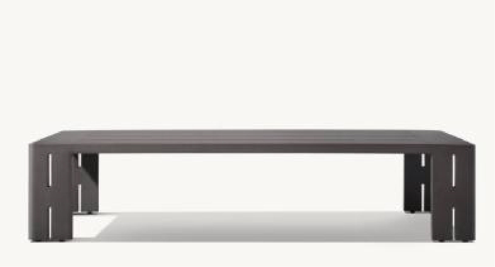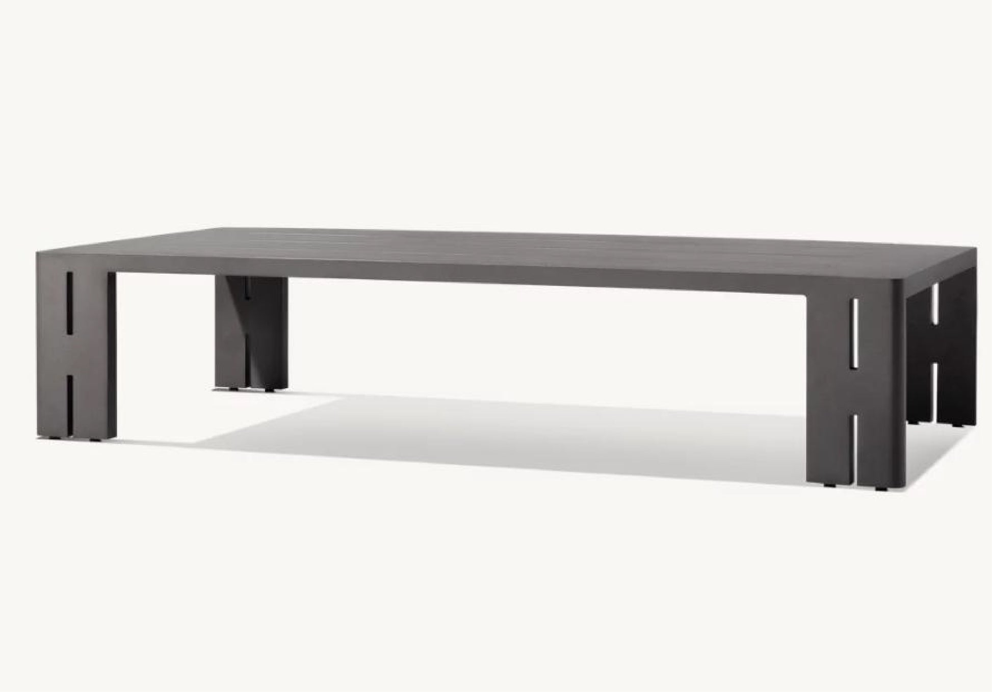 The Mati Coffee Table grounds any lounge arrangement with its strong, sculptural presence. Made entirely of powder-coated aluminum, it features clean planes, slotted leg details, and a wide slatted top for added texture and functionality. Its minimalist design pairs seamlessly with both the Mati collection and other modern outdoor settings.