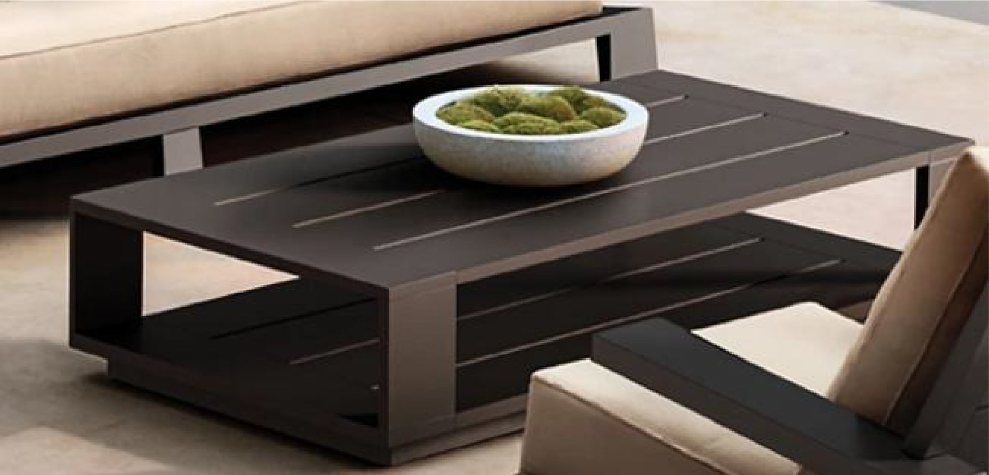 The Olli Coffee Table balances bold presence with practical design. Featuring a slatted aluminum top and a built-in lower shelf, it offers both visual texture and functional storage. Clean lines and open sides create an airy, contemporary profile, making it the perfect centerpiece for modern outdoor lounges.