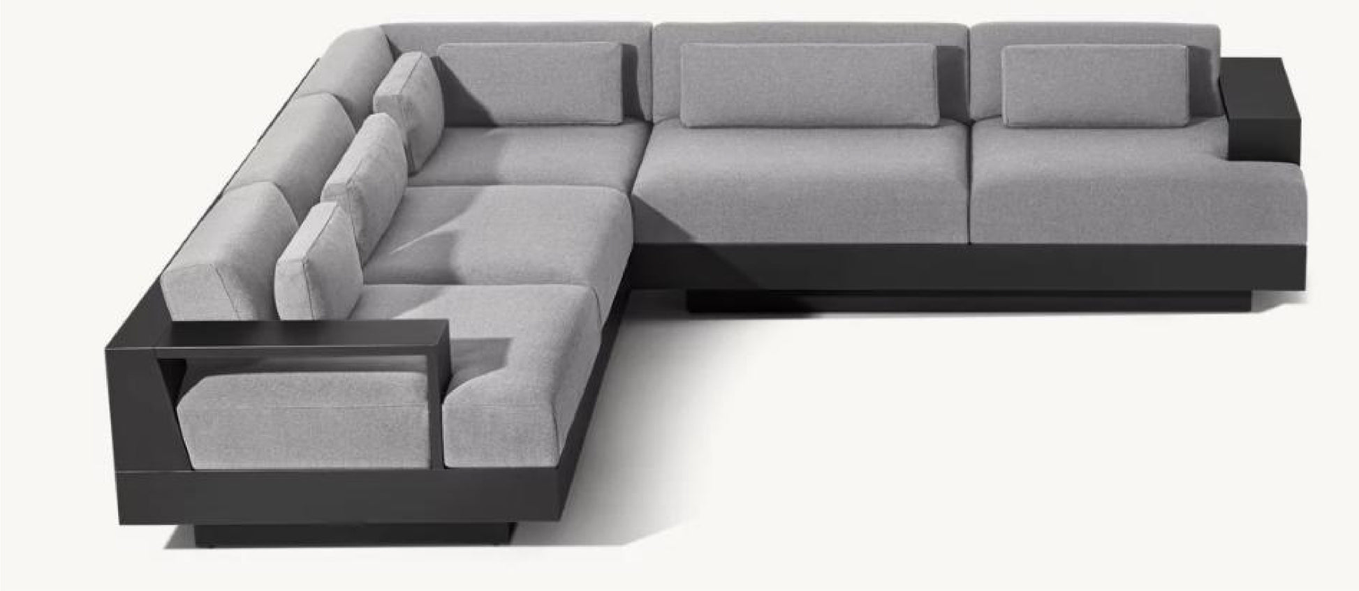 The Casablanca Corner Sofa redefines outdoor luxury with its expansive U-shaped design, crafted from powder-coated aluminum. Featuring plush, neutral cushions and integrated shelving, it offers ample seating and modern functionality, ideal for large gatherings in sophisticated settings.
