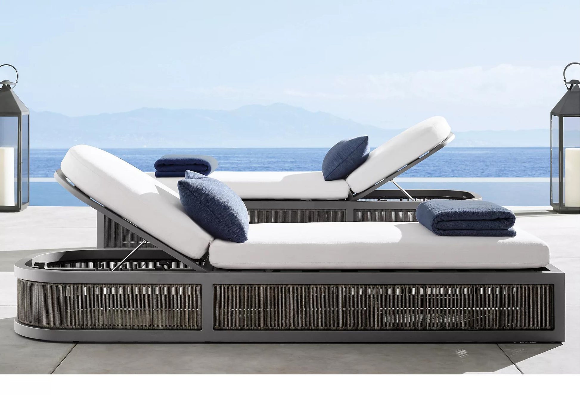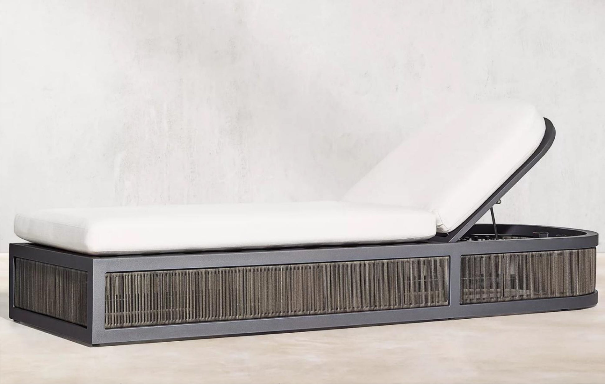 The Feryba Day Bed offers luxurious relaxation with its aluminum frame and woven wicker sides. Featuring plush white cushions and an adjustable backrest, its sleek design creates a perfect retreat for outdoor lounging by the pool or patio.