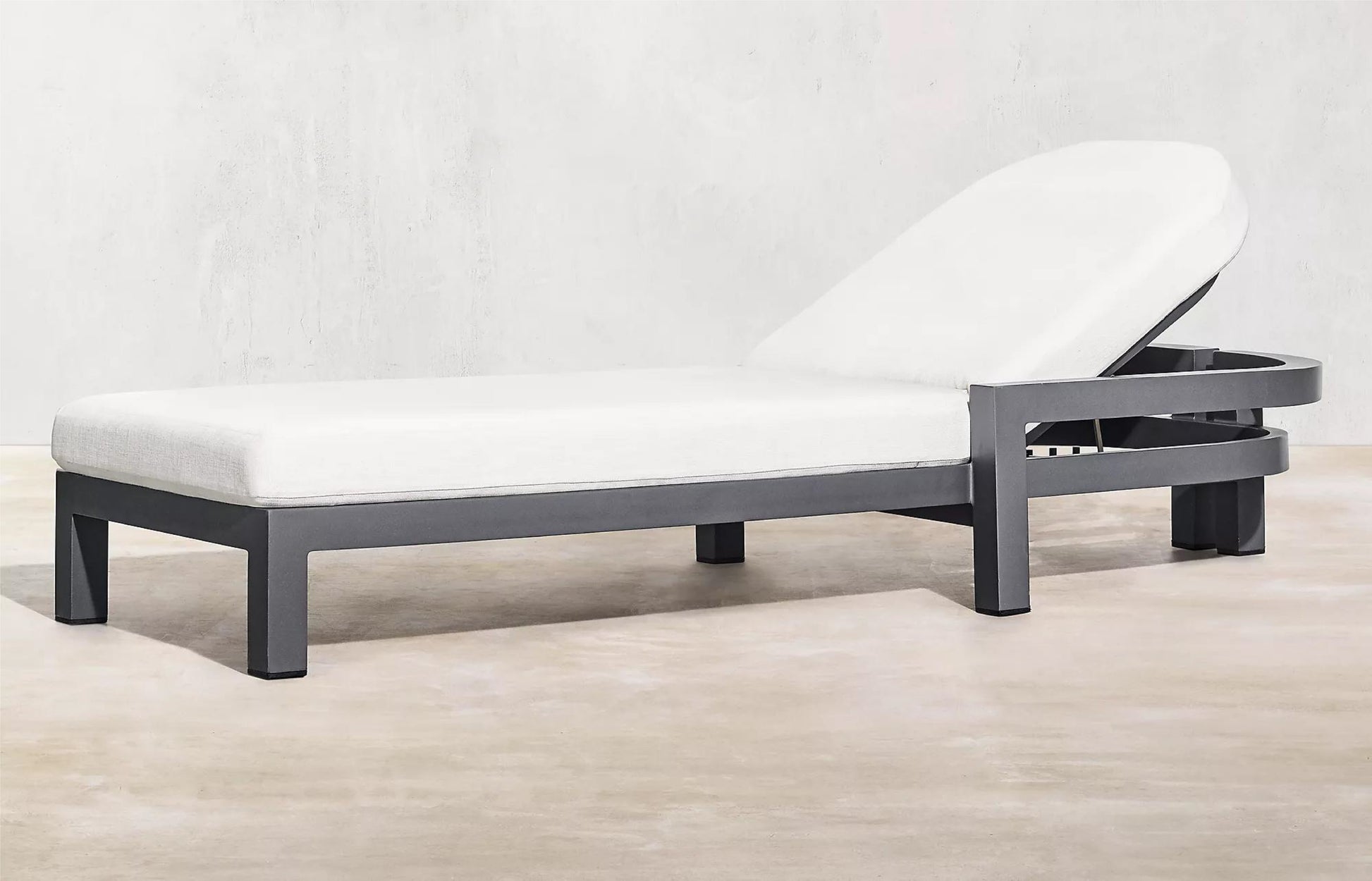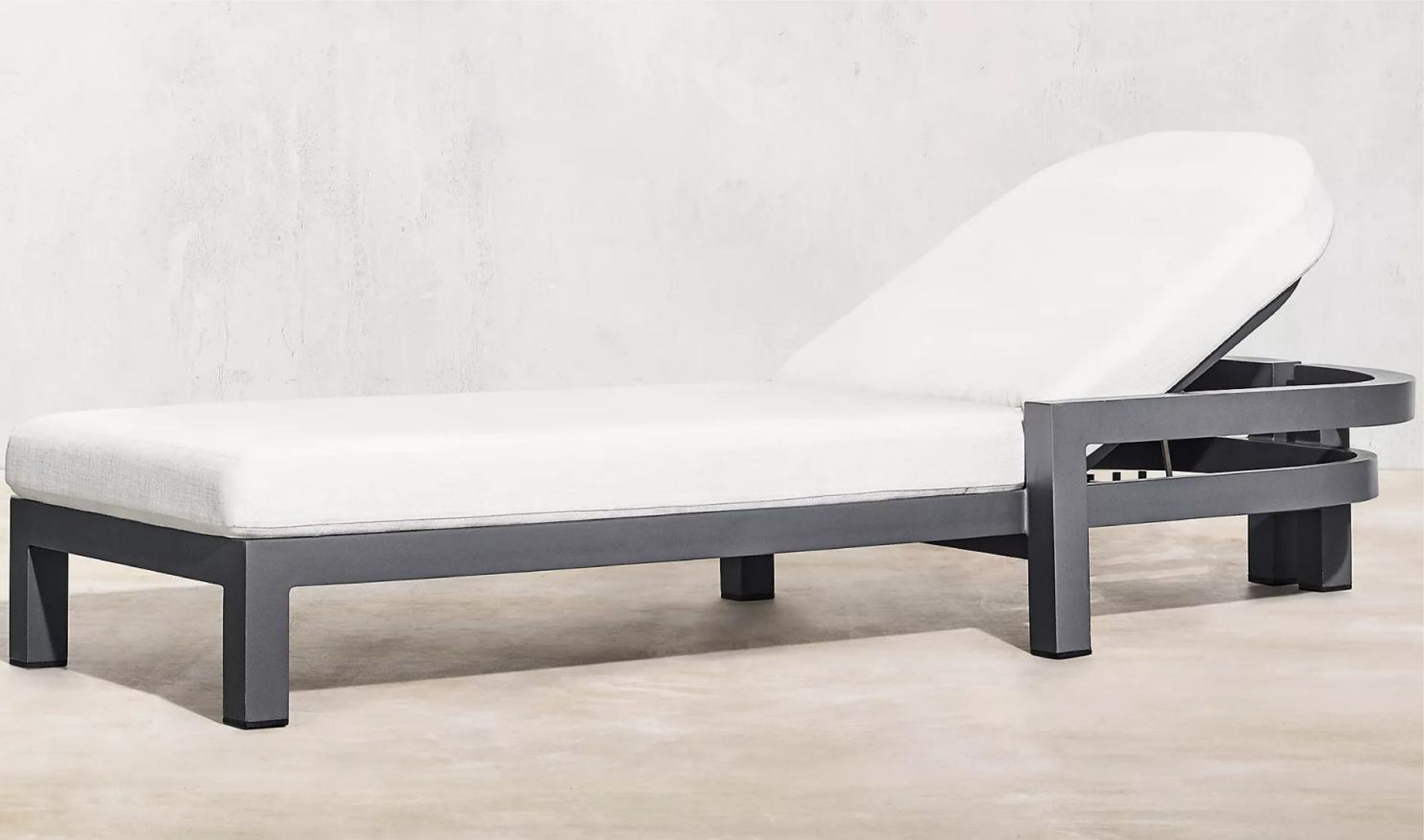 The Portino Day Bed offers luxurious outdoor relaxation with its dark powder-coated aluminum frame and plush white cushions. Its adjustable backrest and spacious design provide a sleek, modern retreat for ultimate comfort in stylish settings.