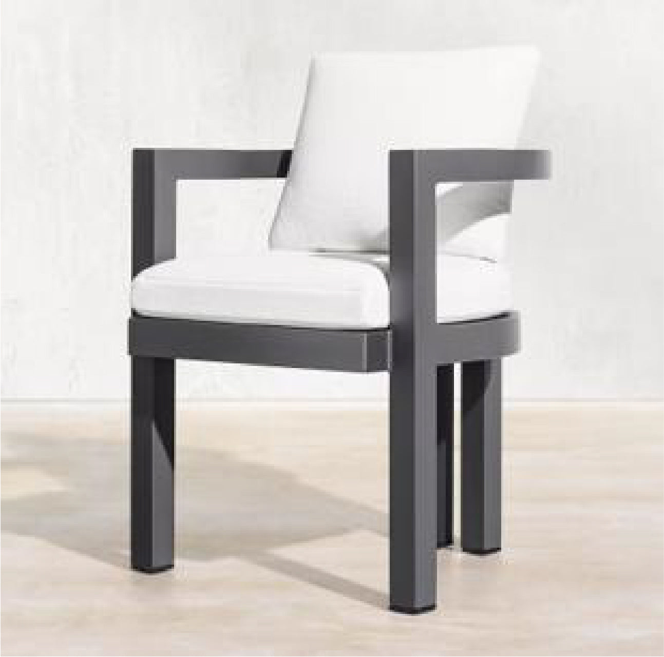 The Portino Dining Chair blends sleek modern design with comfort, featuring a dark powder-coated aluminum frame and plush white cushions. Its geometric, open-arm structure offers a bold yet refined look for elegant outdoor dining.