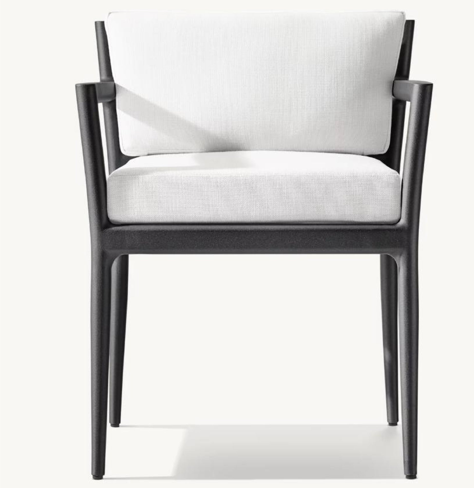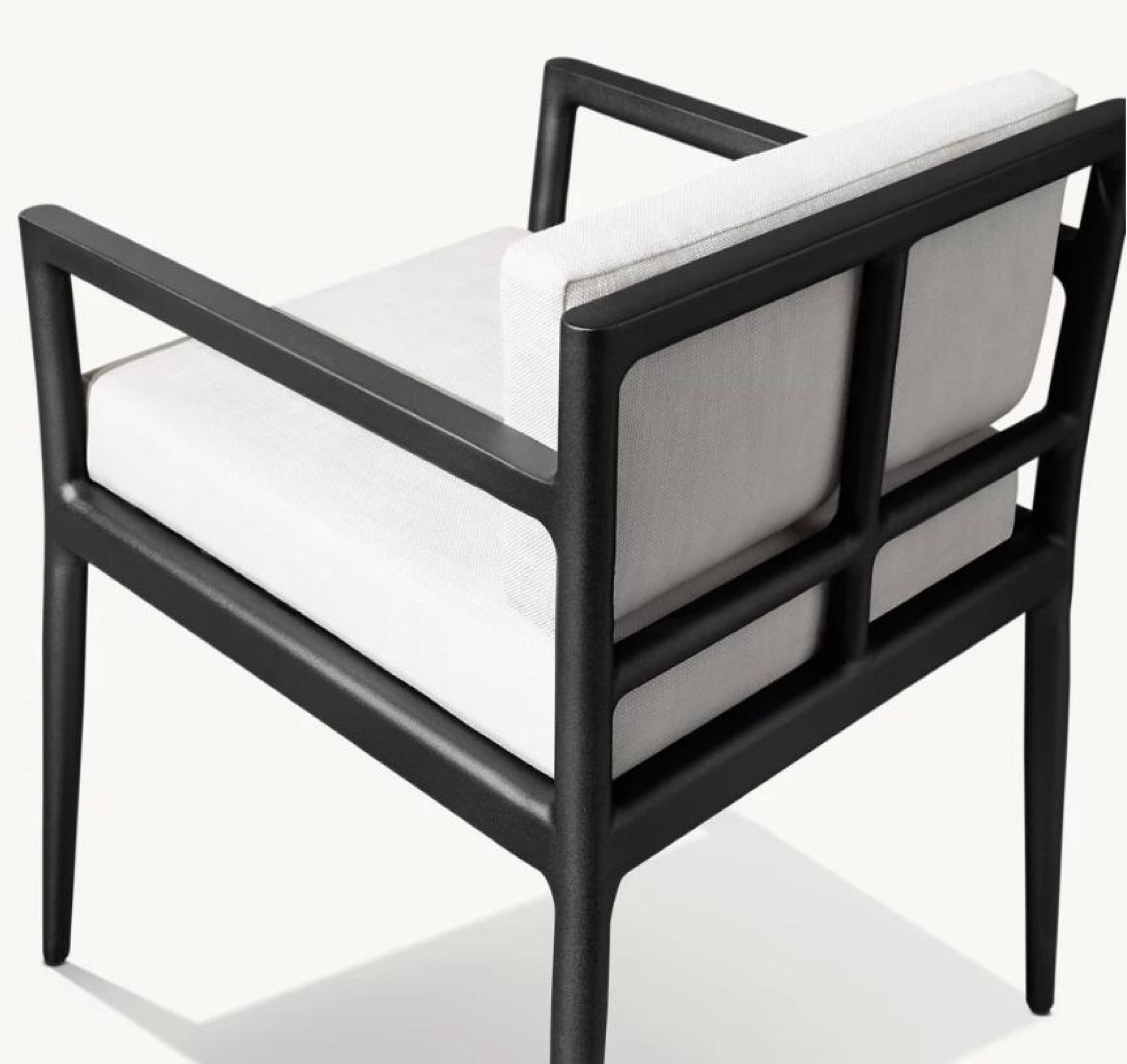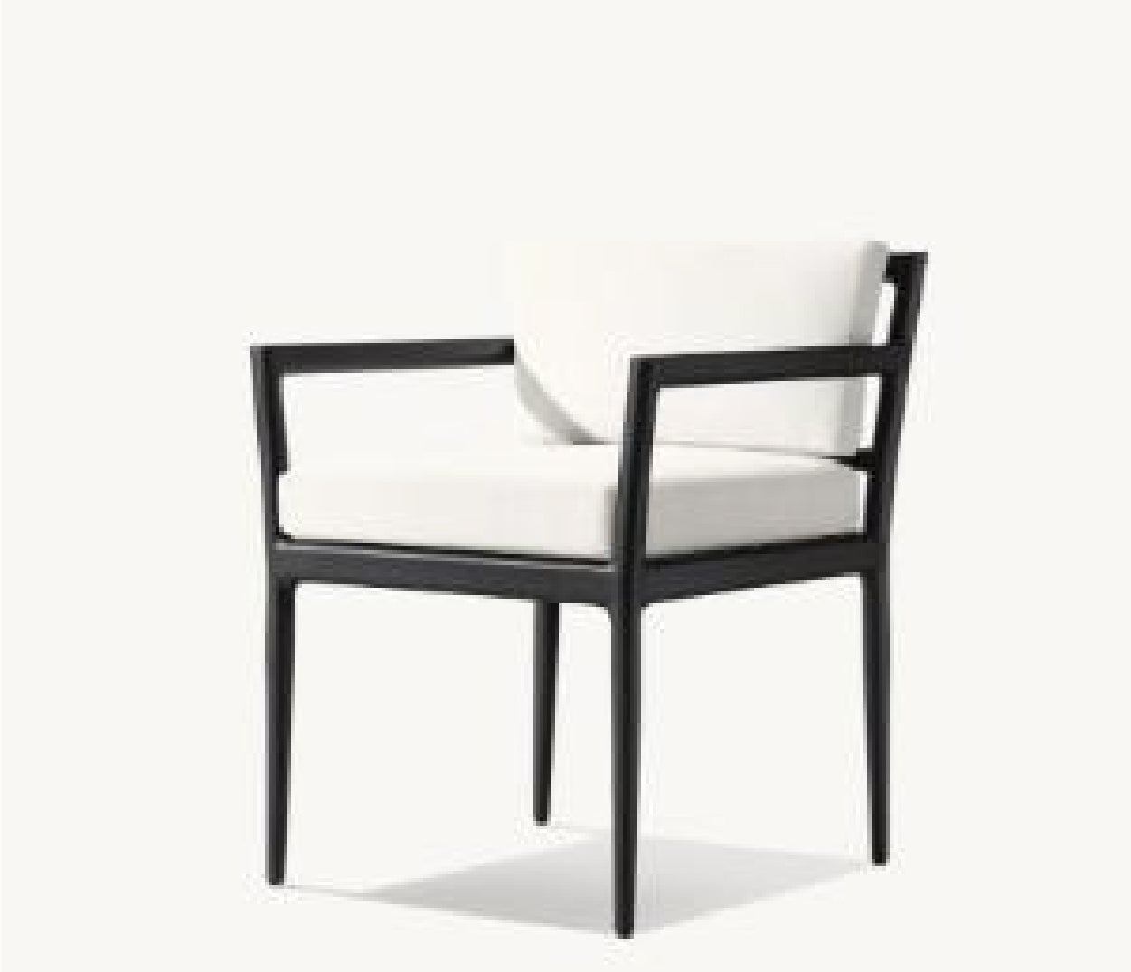 The Lawrie Dining Chair combines modern simplicity with comfort, featuring a dark-stained wooden frame with sleek horizontal slats and plush, light-toned cushions. Its open-back design and sturdy construction make it ideal for elegant outdoor dining.