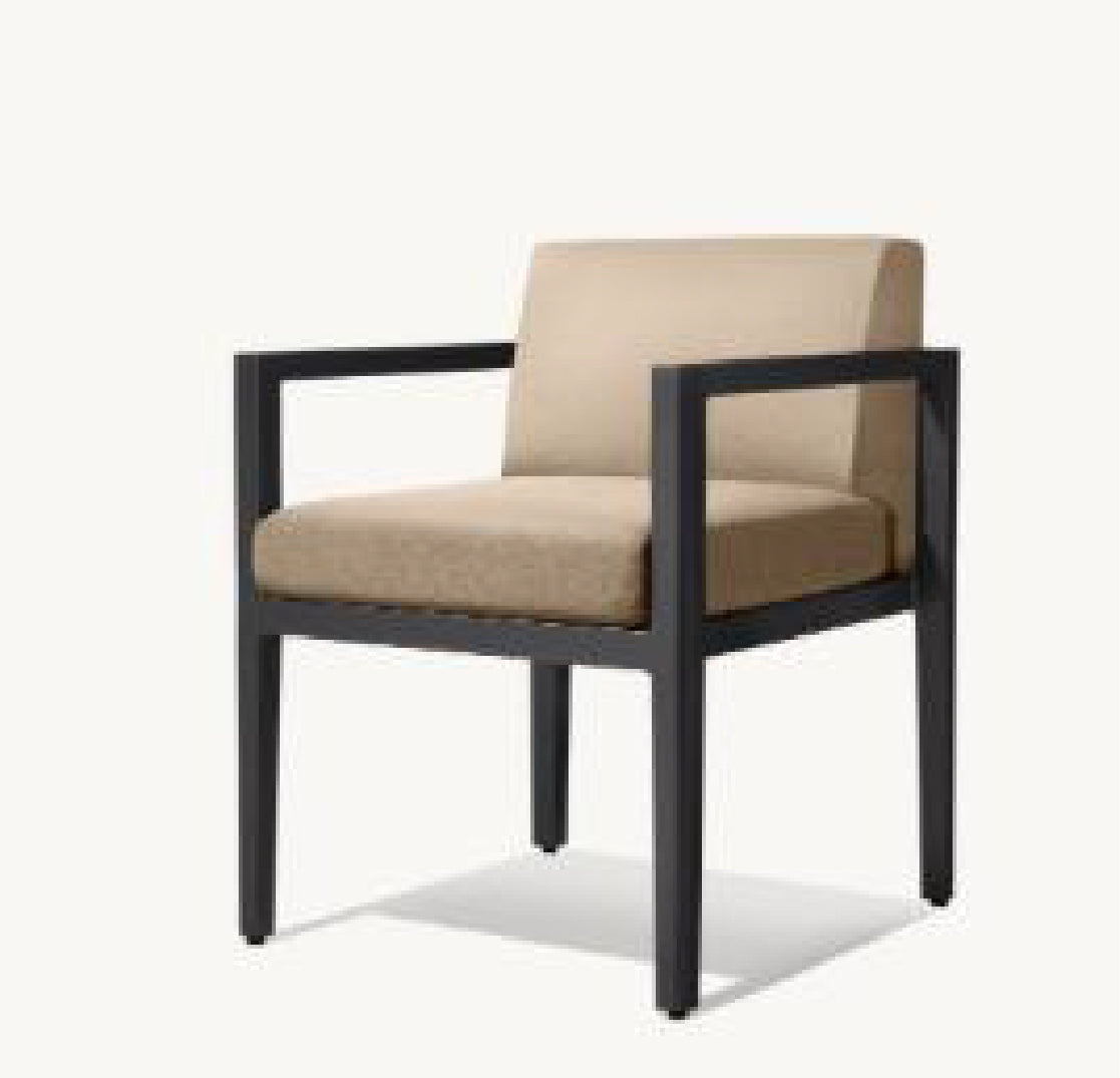 The Sande Dining Chair brings minimalist precision to the dining space. Its angular aluminum frame is balanced by plush, supportive cushions for a look that’s crisp yet inviting. Designed to withstand the elements while offering refined indoor style, this chair anchors any dining setup with clean, modern confidence.