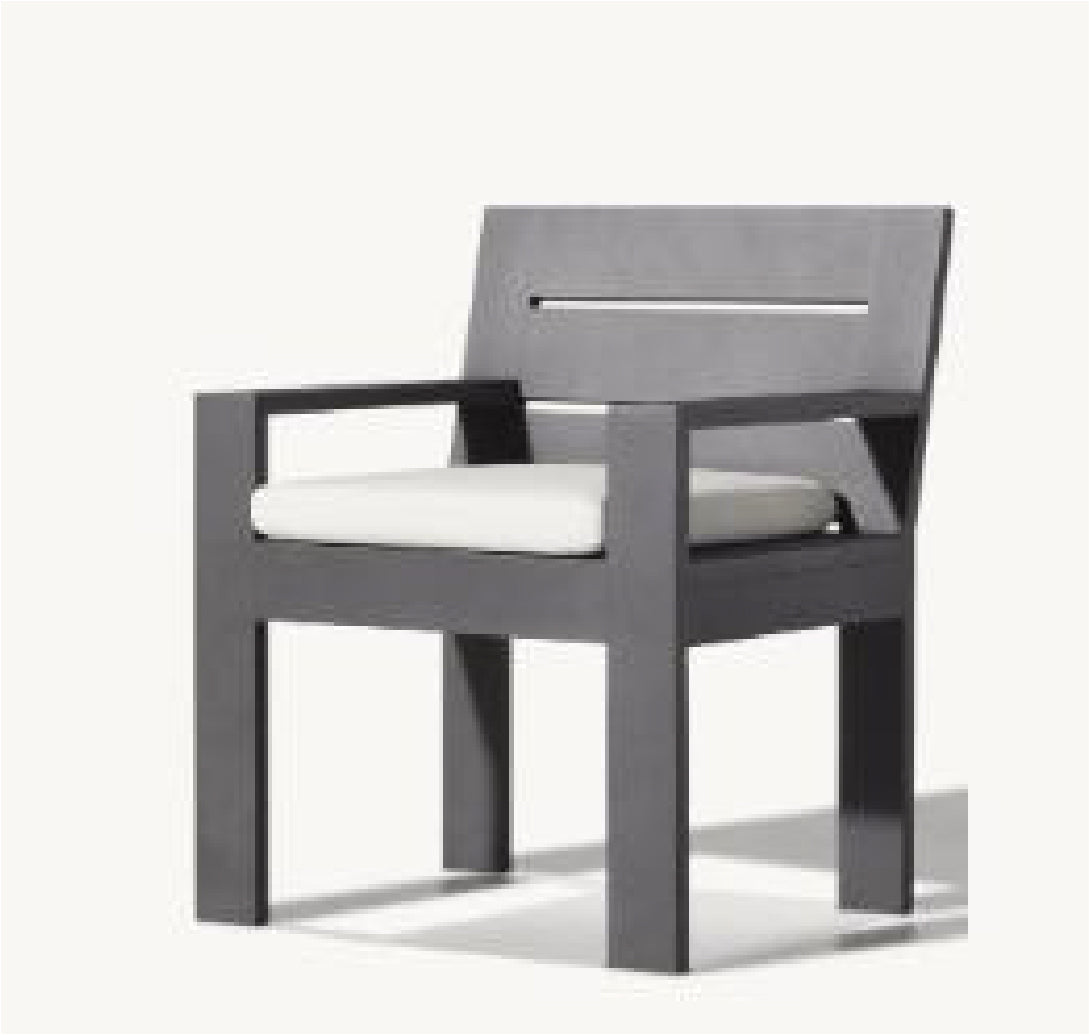 The Bella Dining Chair delivers a bold, modern aesthetic with uncompromising durability. Its linear frame features broad, squared legs and a slotted backrest for subtle texture and airflow. Topped with a tailored seat cushion, this chair pairs clean geometry with comfort—perfect for elevating any outdoor dining experience.