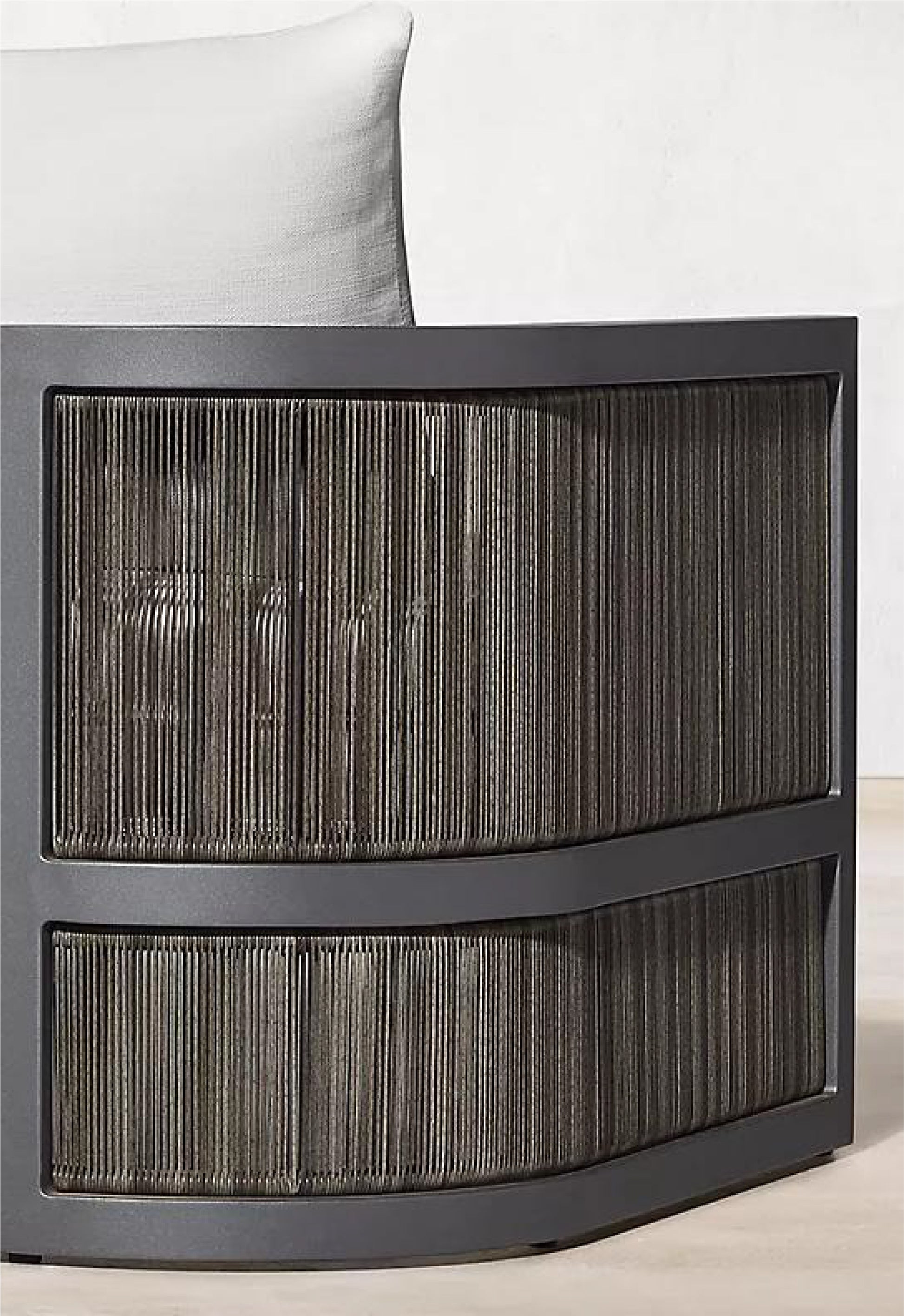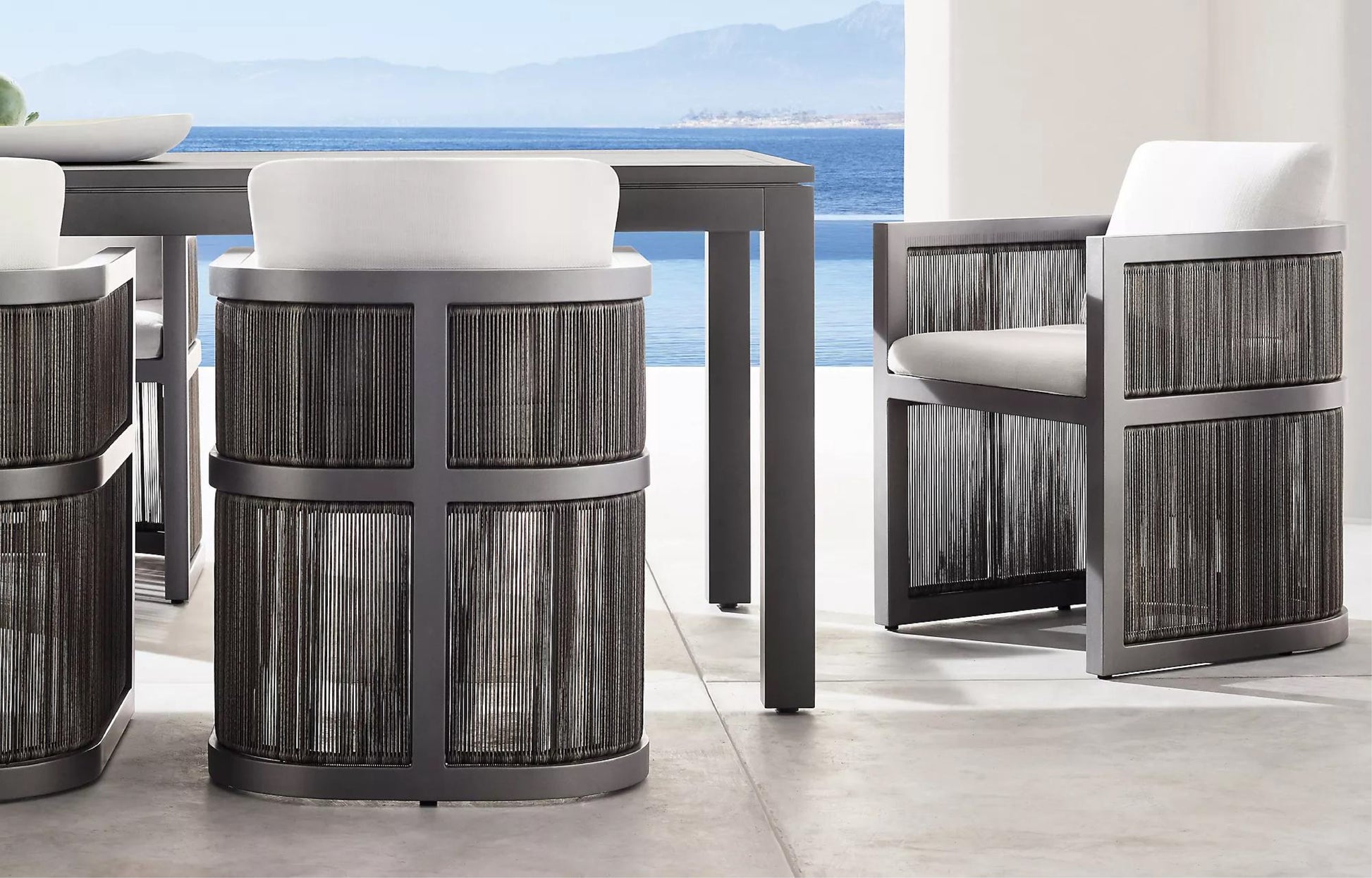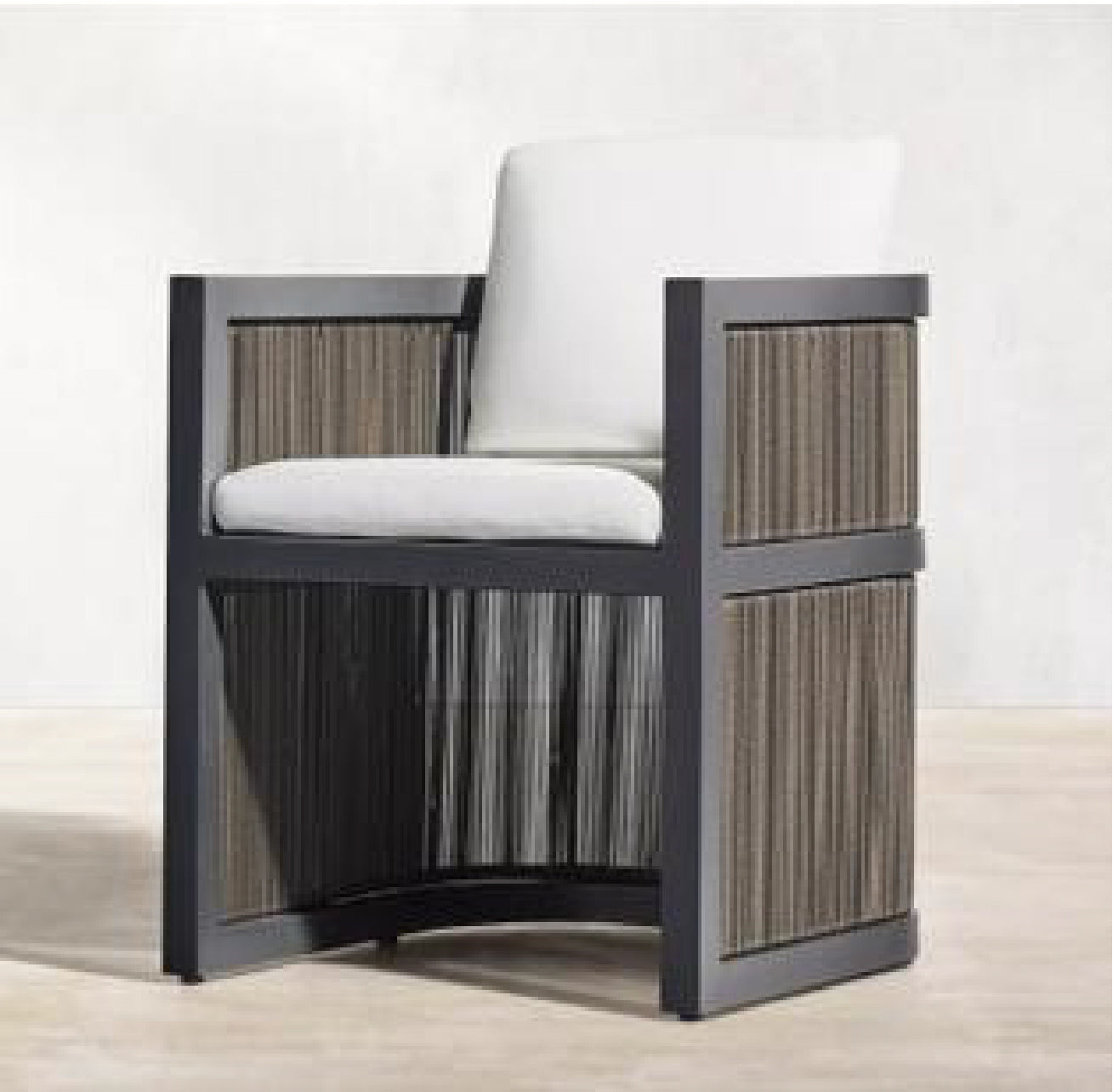 The Feryba Dining Chair combines modern elegance with comfort, featuring an aluminum frame and woven wicker sides. Its plush white cushions and sturdy, rounded design make it a sleek addition to sophisticated outdoor dining spaces.