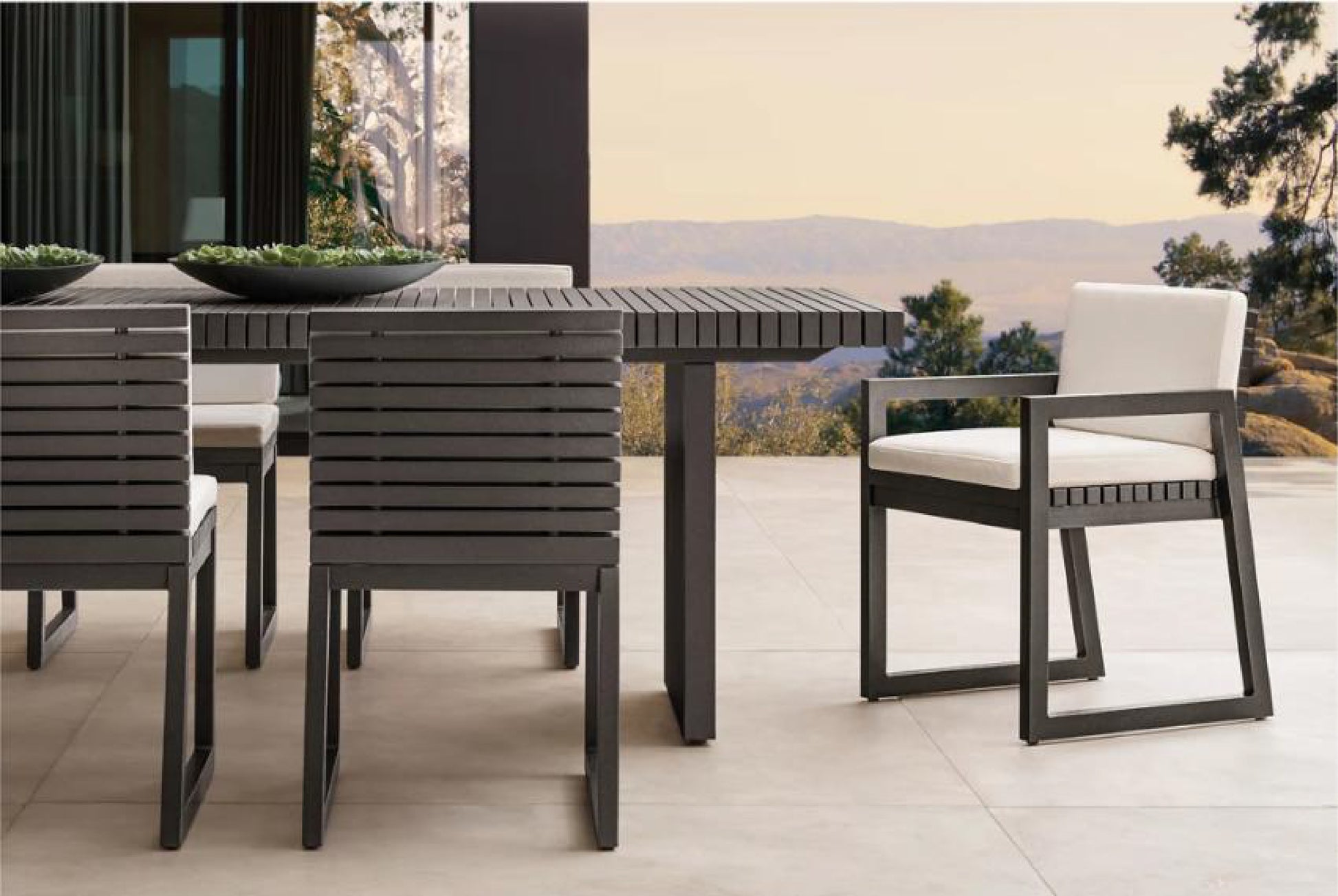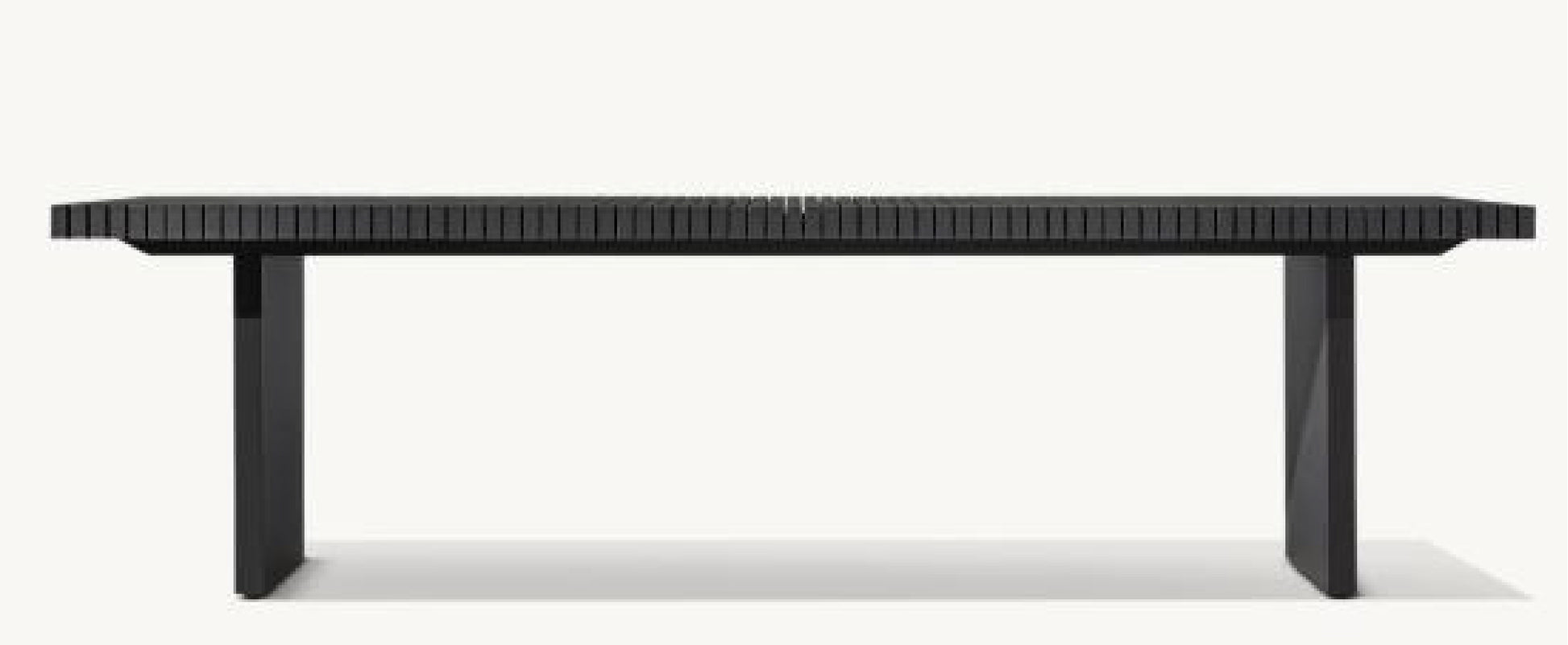 The Cicci Dining Table features a sleek, dark-finished frame with a minimalist slatted top, creating a bold yet refined look. Its sturdy, expansive surface offers a modern centerpiece for sophisticated outdoor dining gatherings.