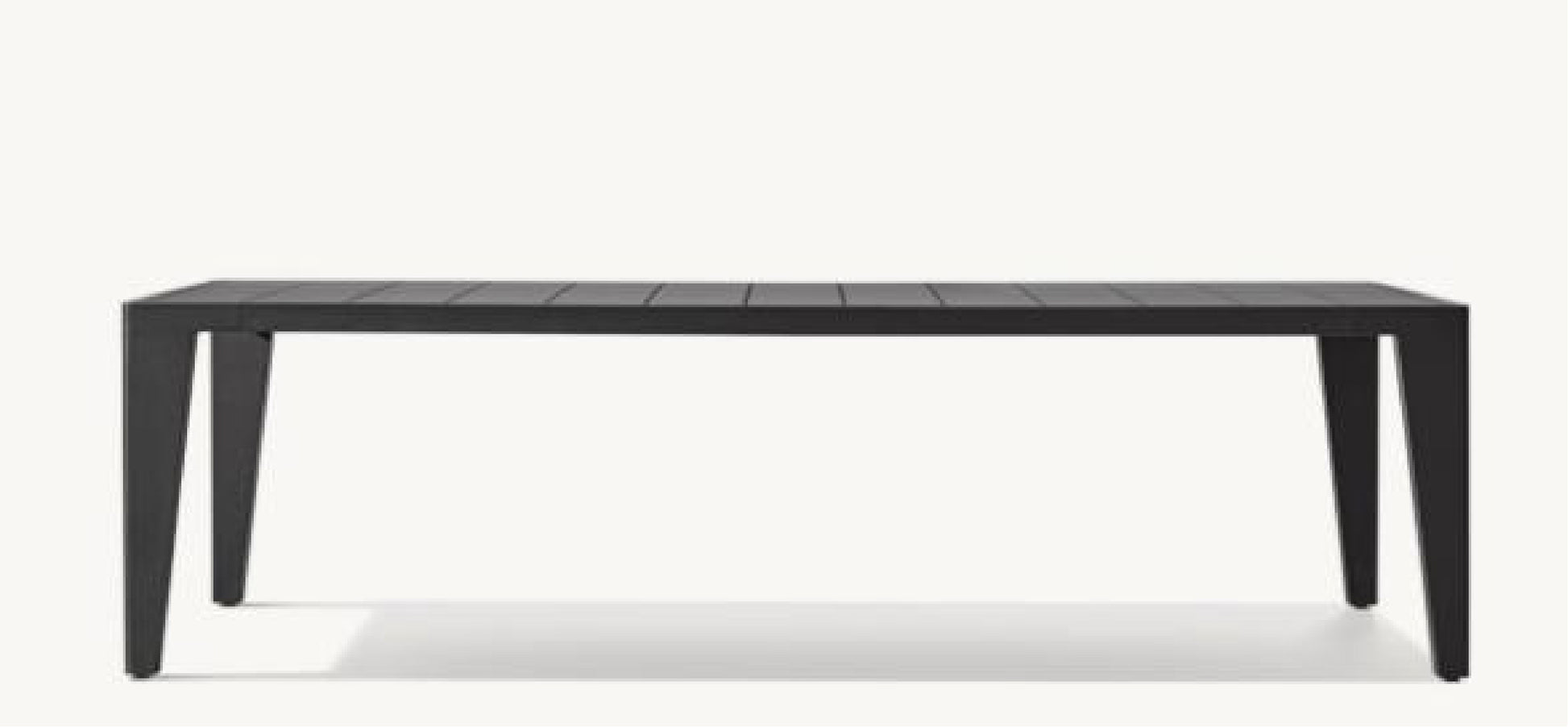 The Mia Dining Table elevates outdoor dining with its dark powder-coated frame and sleek, slatted surface. Its expansive design and sturdy, angled legs create a modern focal point for gatherings.