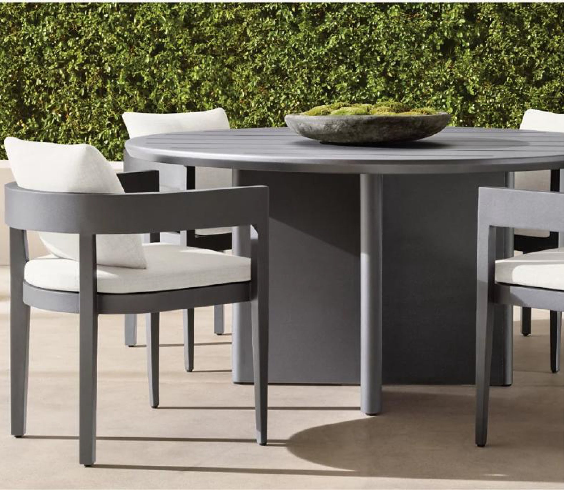 The Bimini Round Dining Table offers modern sophistication with its gray powder-coated aluminum construction and smooth, circular surface. Available in two sizes, its bold, intersecting base provides sturdy elegance for intimate or expansive outdoor dining settings.