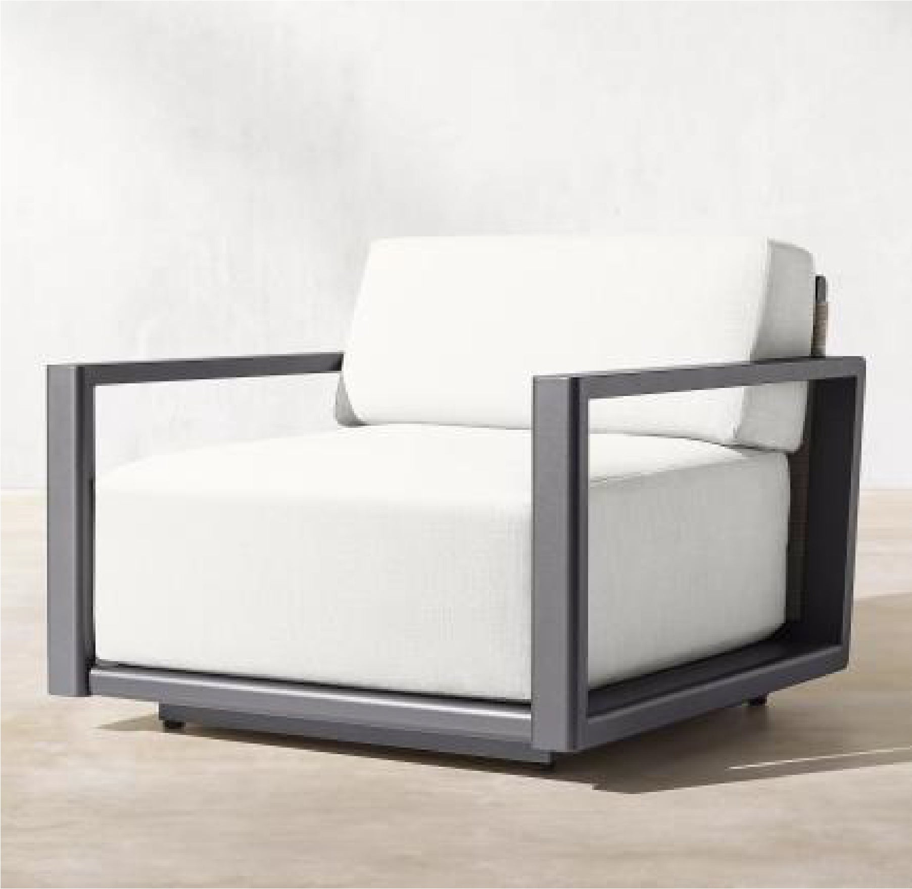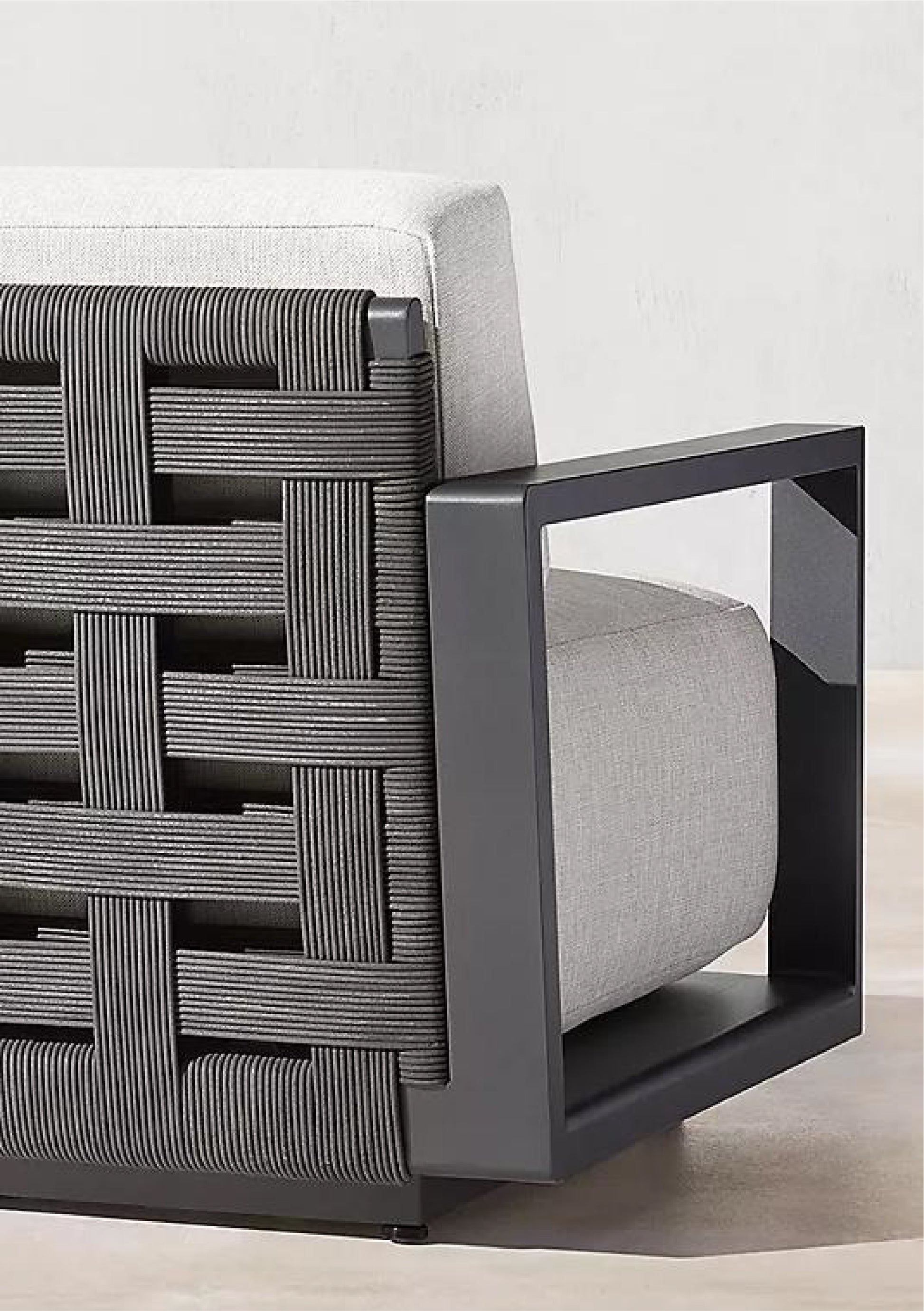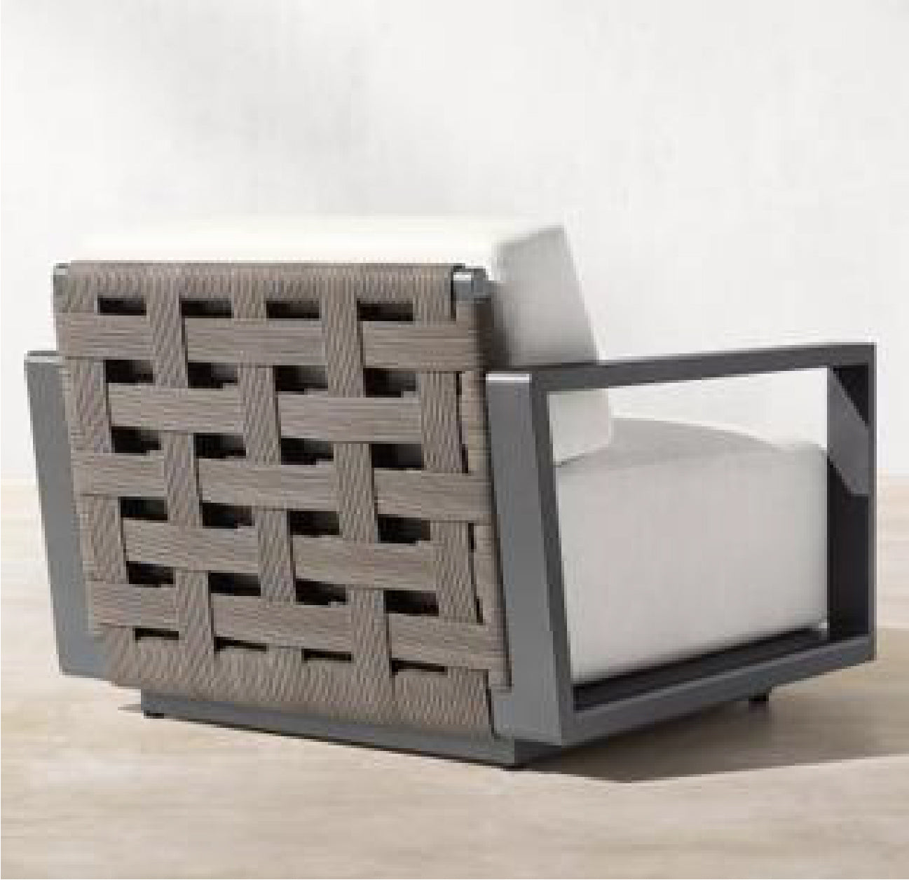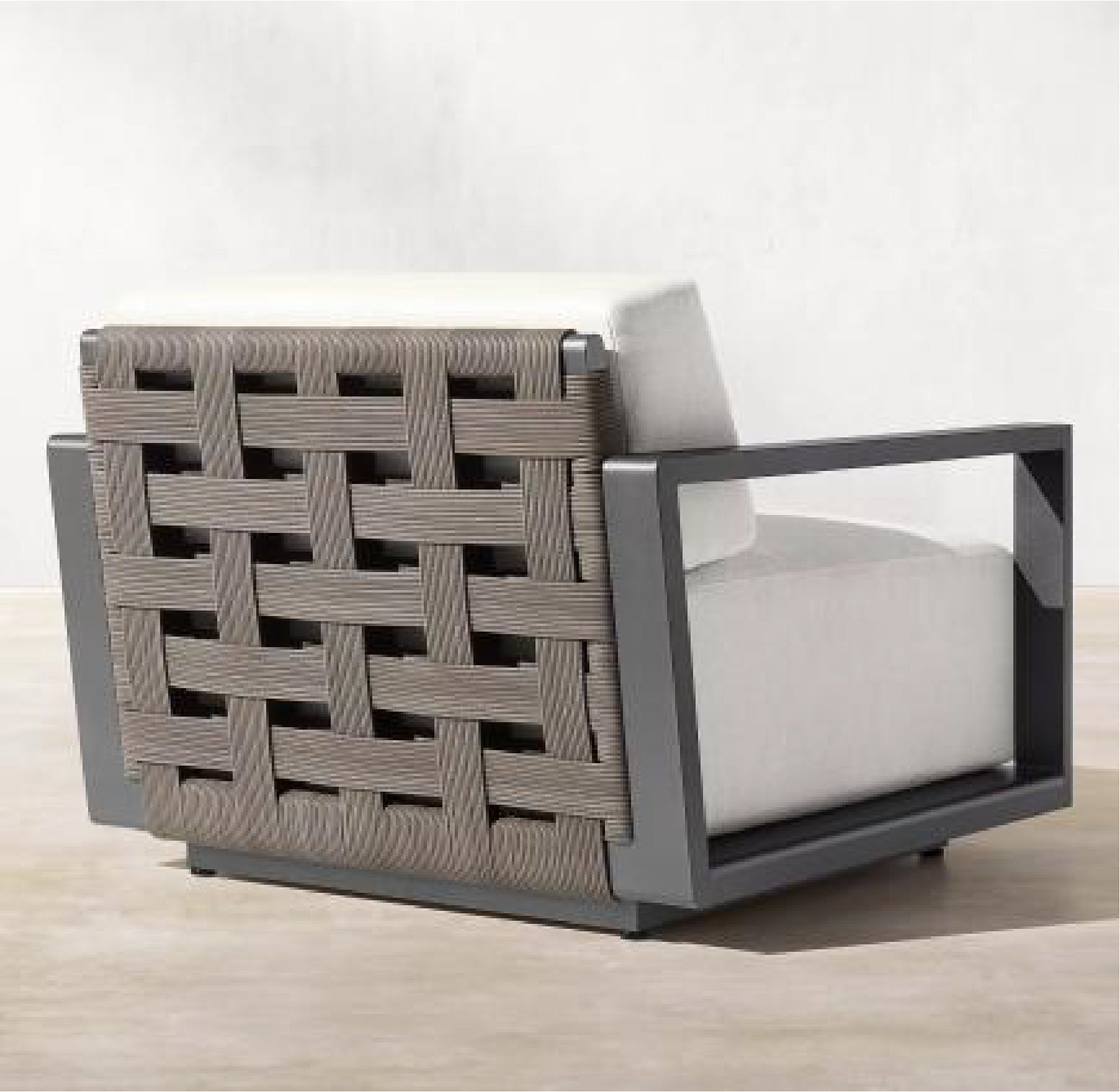 The Margo Single Sofa blends modern sophistication with tactile elegance, featuring a sturdy aluminum frame and a geometric woven backrest. Its plush, neutral cushions and open-arm design create a sleek, inviting seat for refined outdoor relaxation.