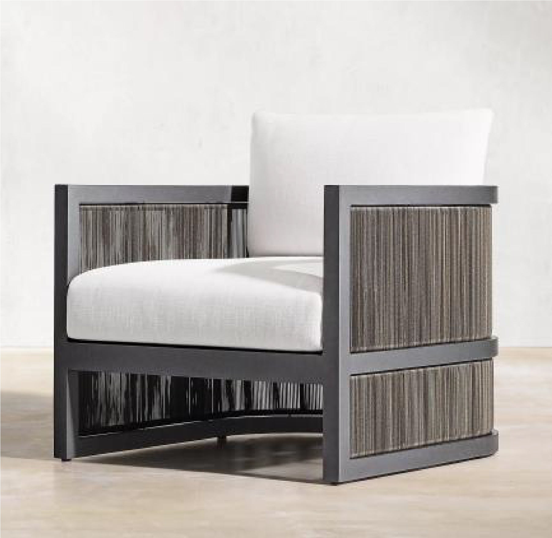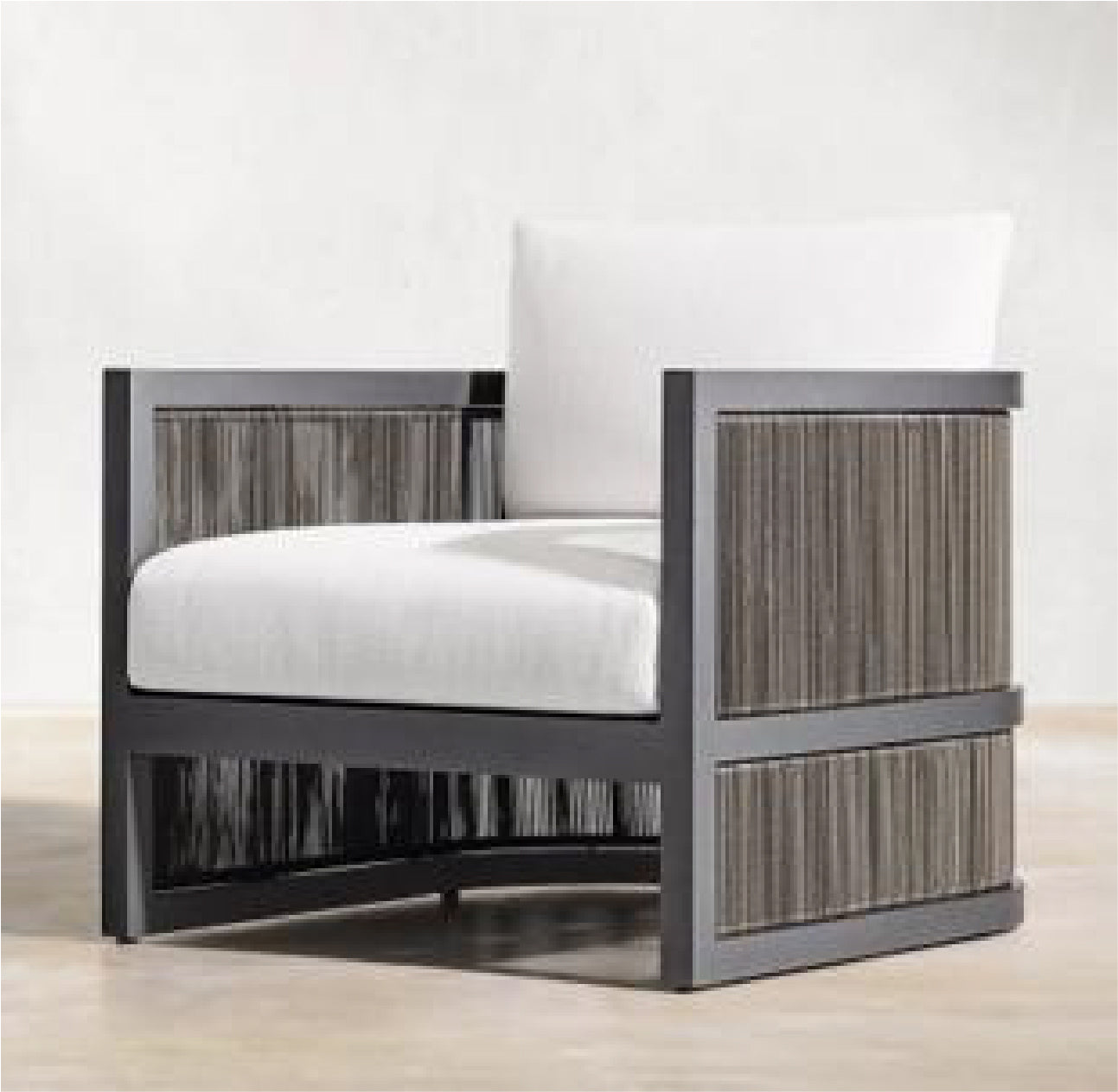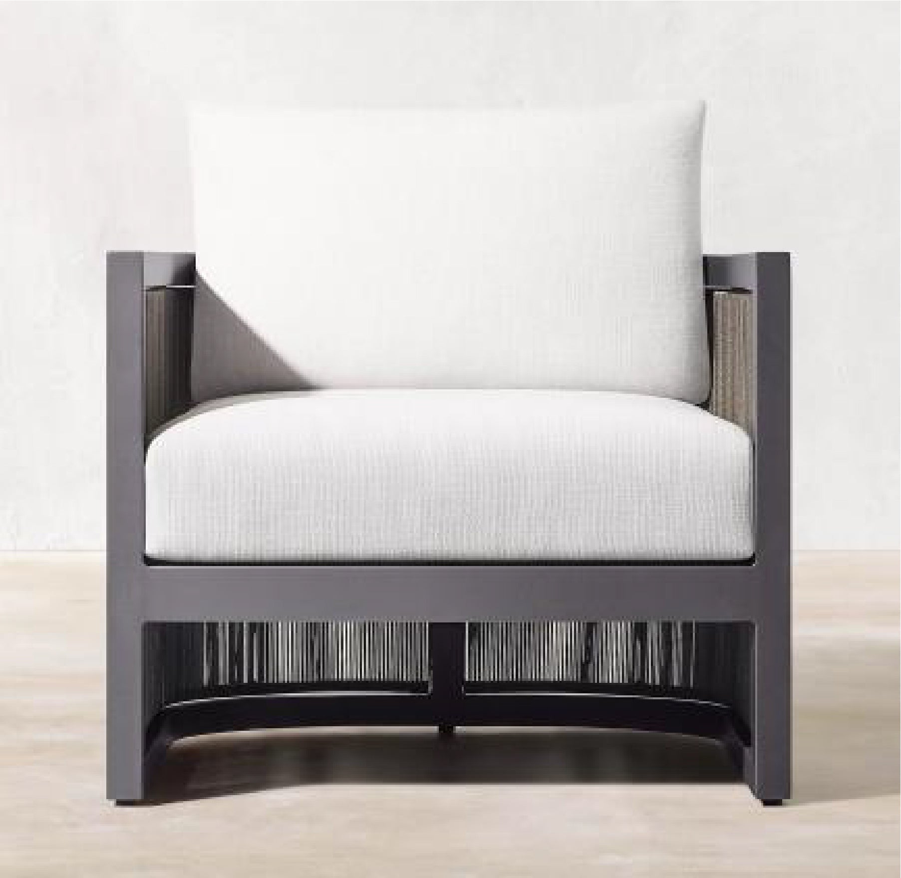 The Feryba Single Sofa offers modern sophistication with its sturdy aluminum frame and intricately woven wicker sides. Paired with plush, white cushions, its bold, boxy design provides a sleek and inviting seat for stylish outdoor relaxation.