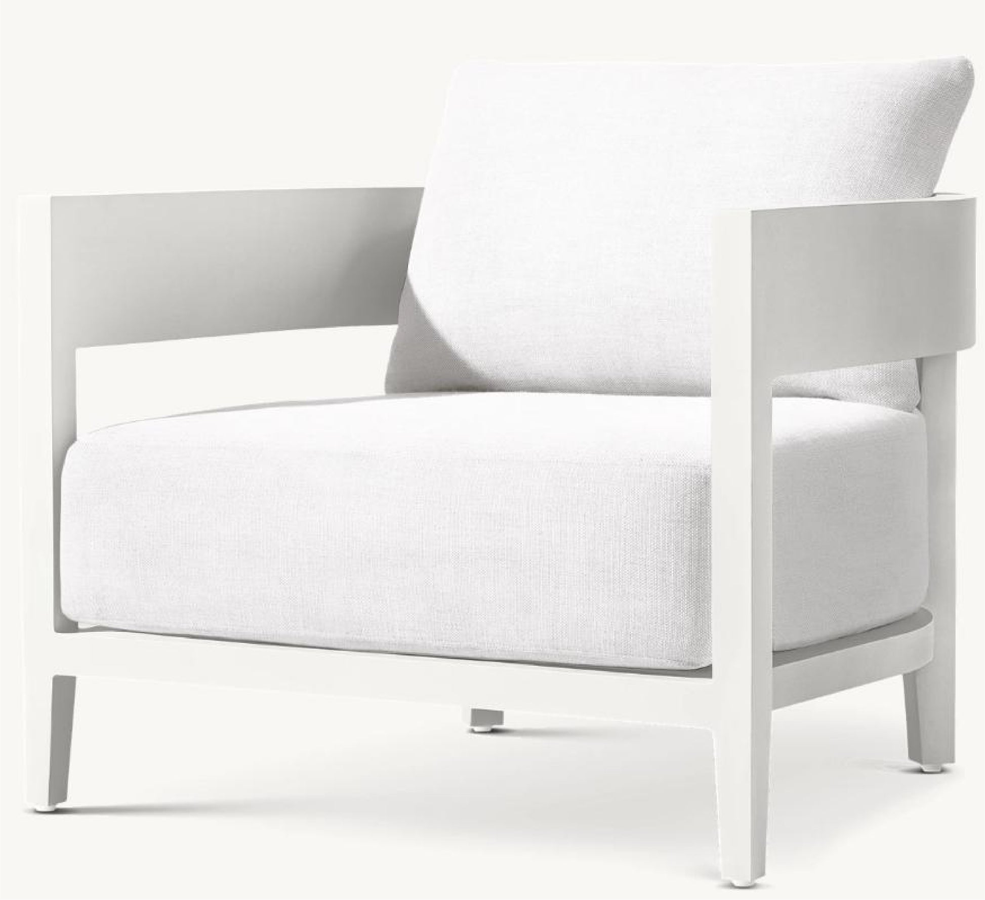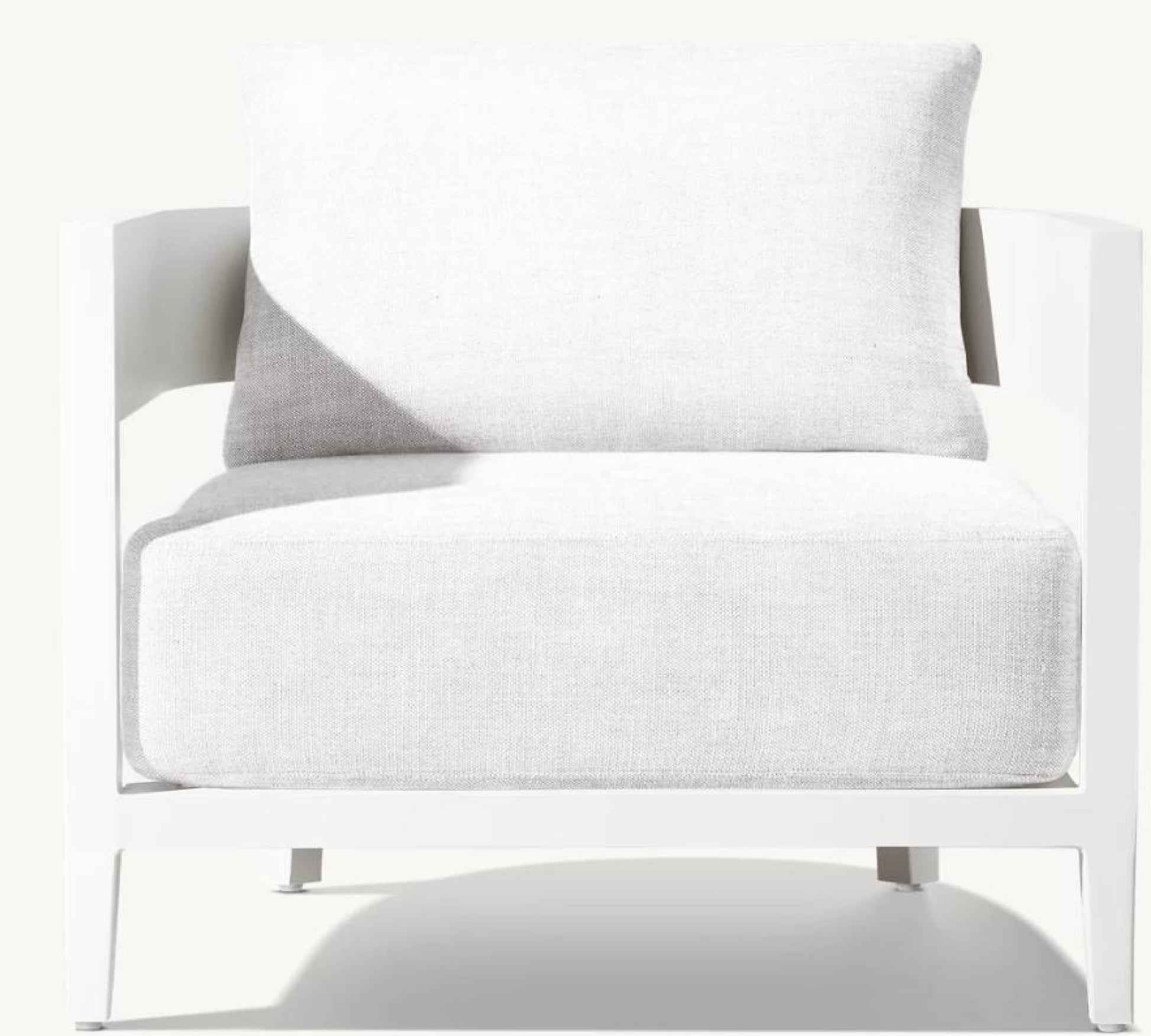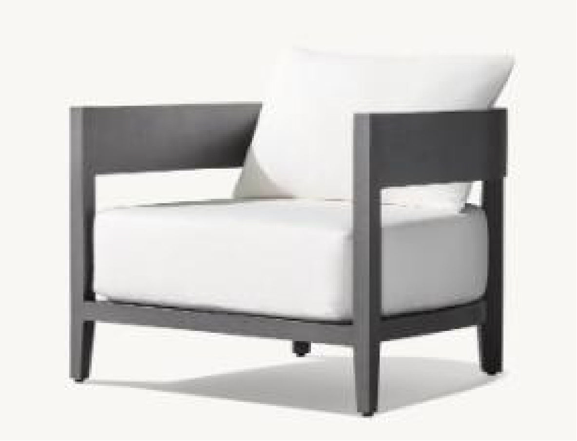 The Bimini Single Sofa offers bold modern comfort with its sturdy white powder-coated aluminum frame and thick, plush white cushions. Its wide, structured arms and deep seat create a striking, minimalist look, perfect for luxurious outdoor relaxation.
