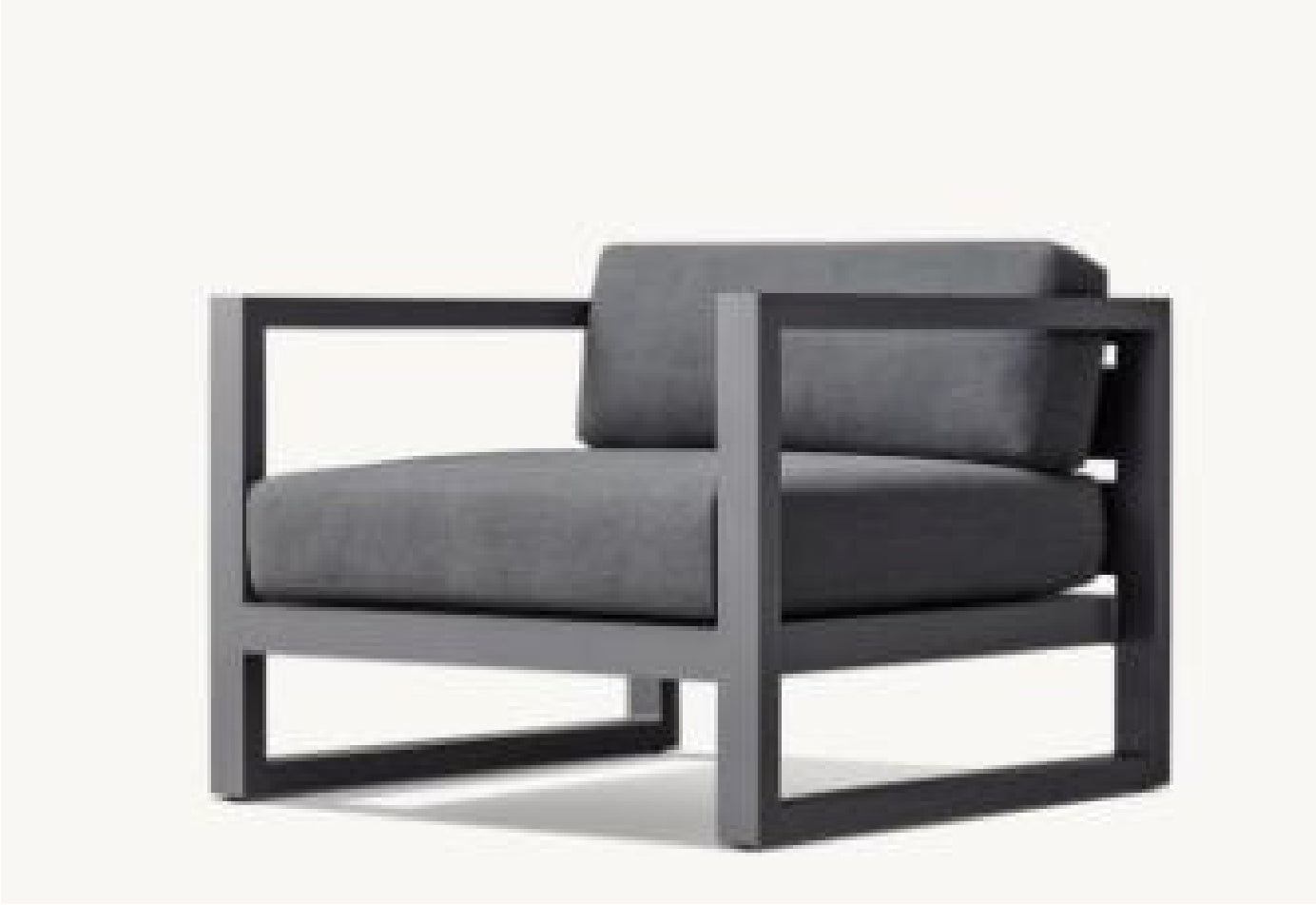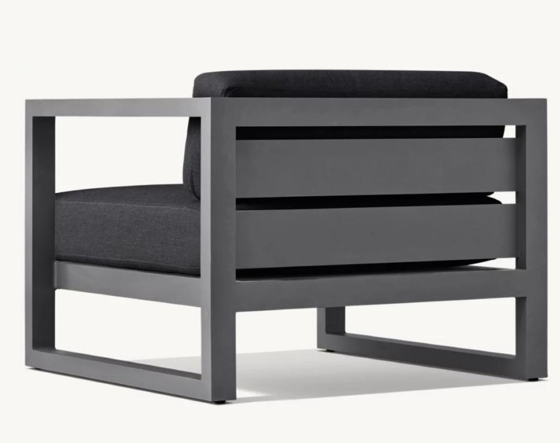 The Aeden Single Sofa embodies bold modern design with its sturdy powder-coated aluminum frame and thick, charcoal-gray cushions. Its open, rectangular structure and minimalist lines create a striking yet comfortable seat, perfect for contemporary outdoor lounging.