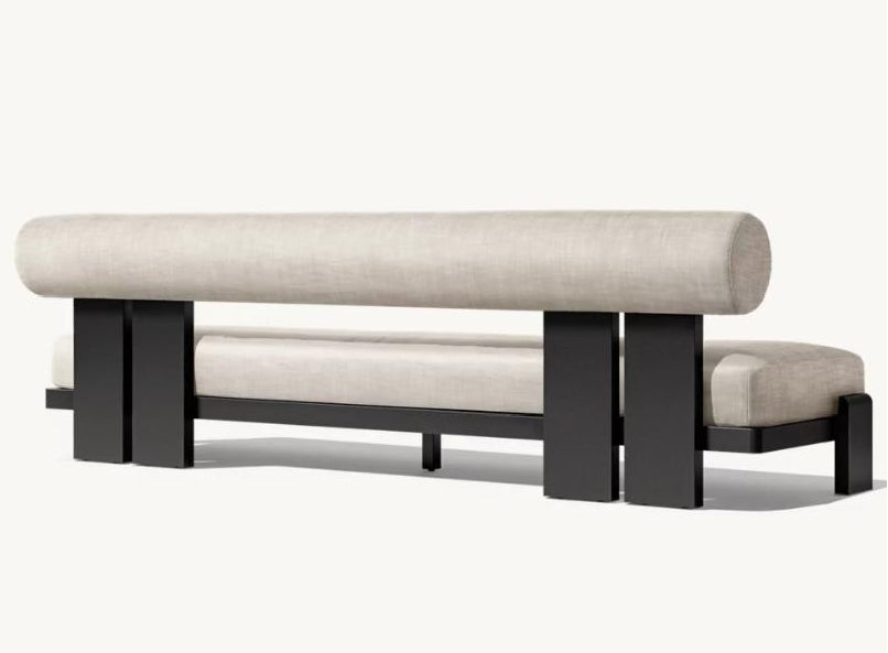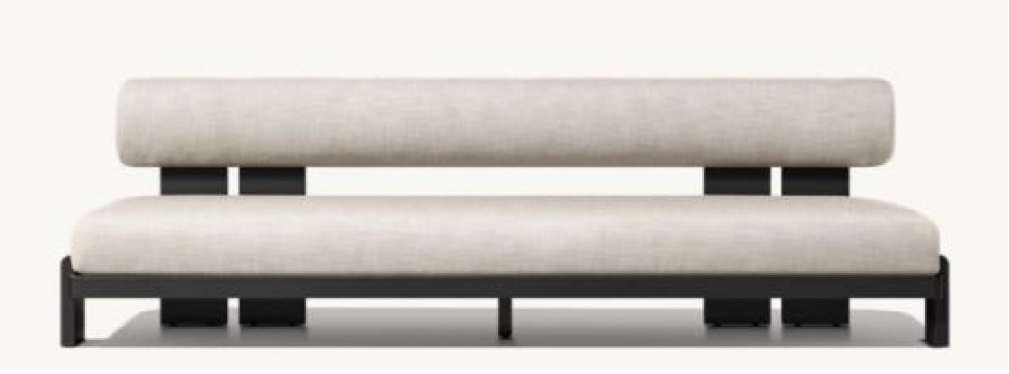The Vita Sofa makes a bold architectural statement while offering deep, inviting comfort. Its oversized cylindrical backrest and wide, low seat rest on a solid black aluminum frame, creating a striking visual contrast. Designed for both indoor and outdoor spaces, this piece brings modernist edge and sculptural elegance to any setting.
