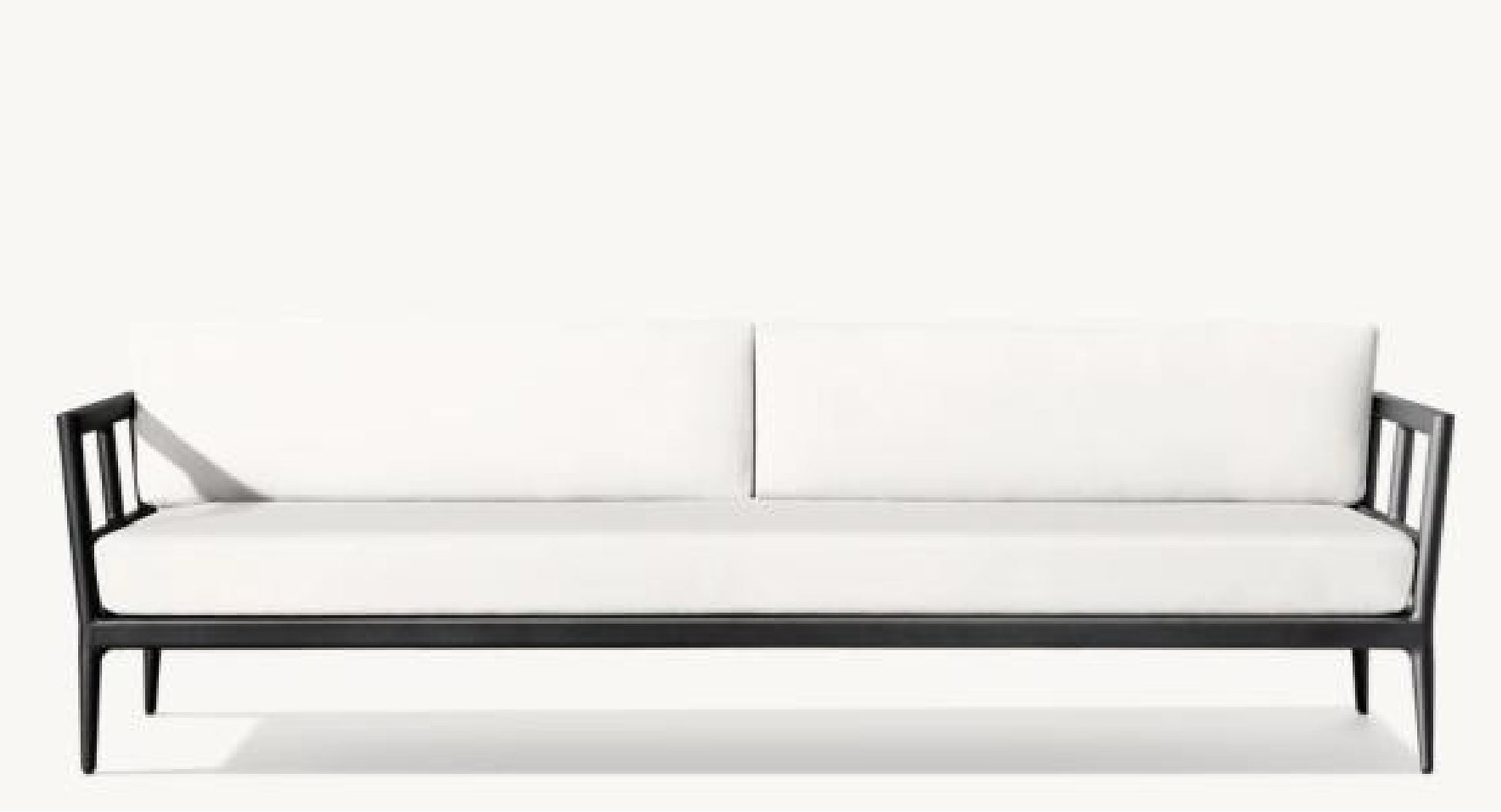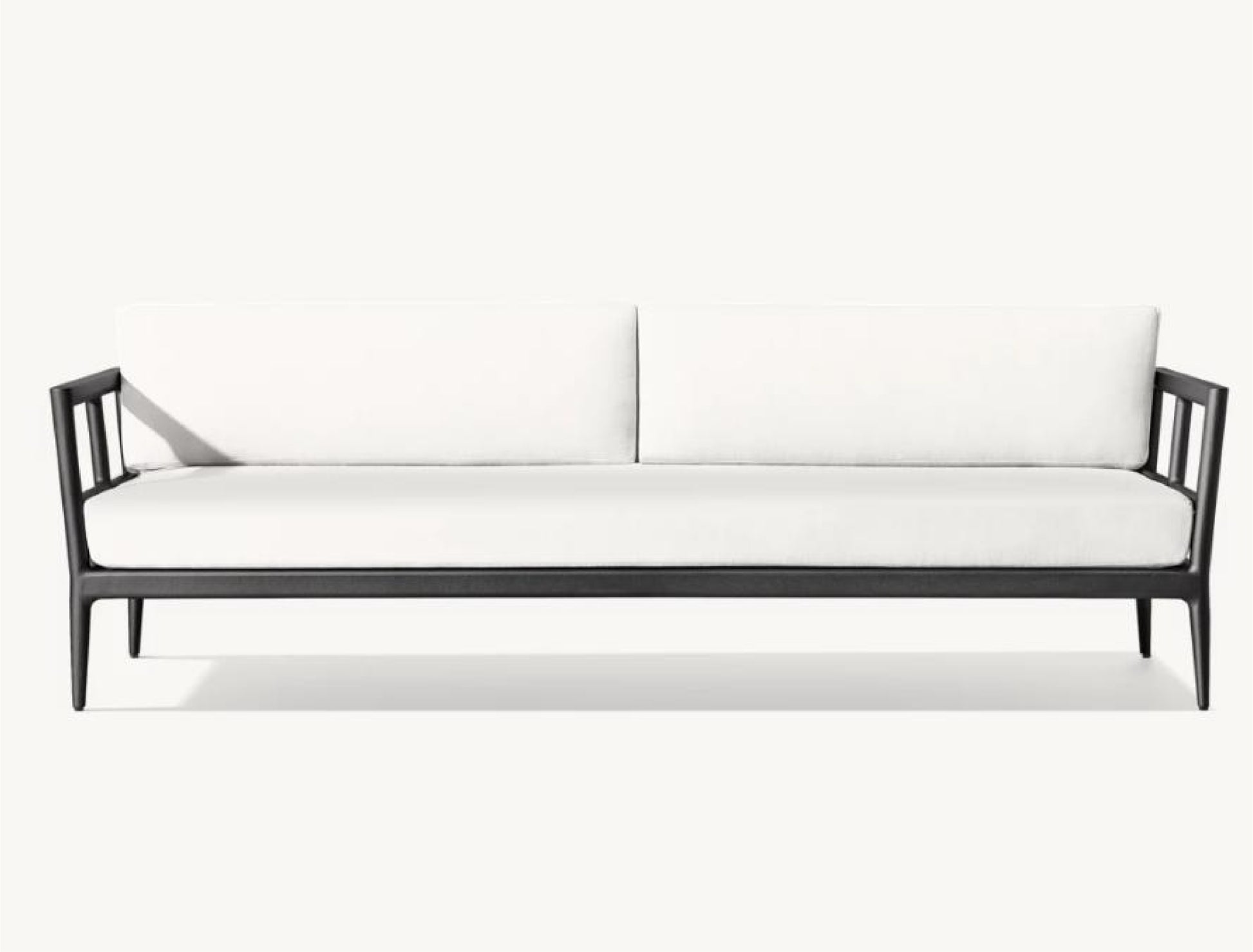 The Lawrie Sofa offers modern sophistication with its dark-stained wooden frame and plush, light-toned cushions, available in two sizes. Its sleek horizontal slats and open-back design create an airy, elegant centerpiece for stylish outdoor lounging.