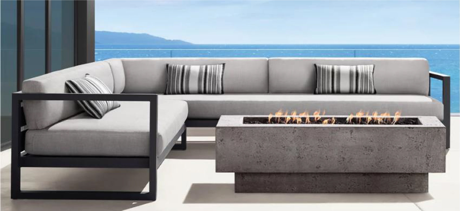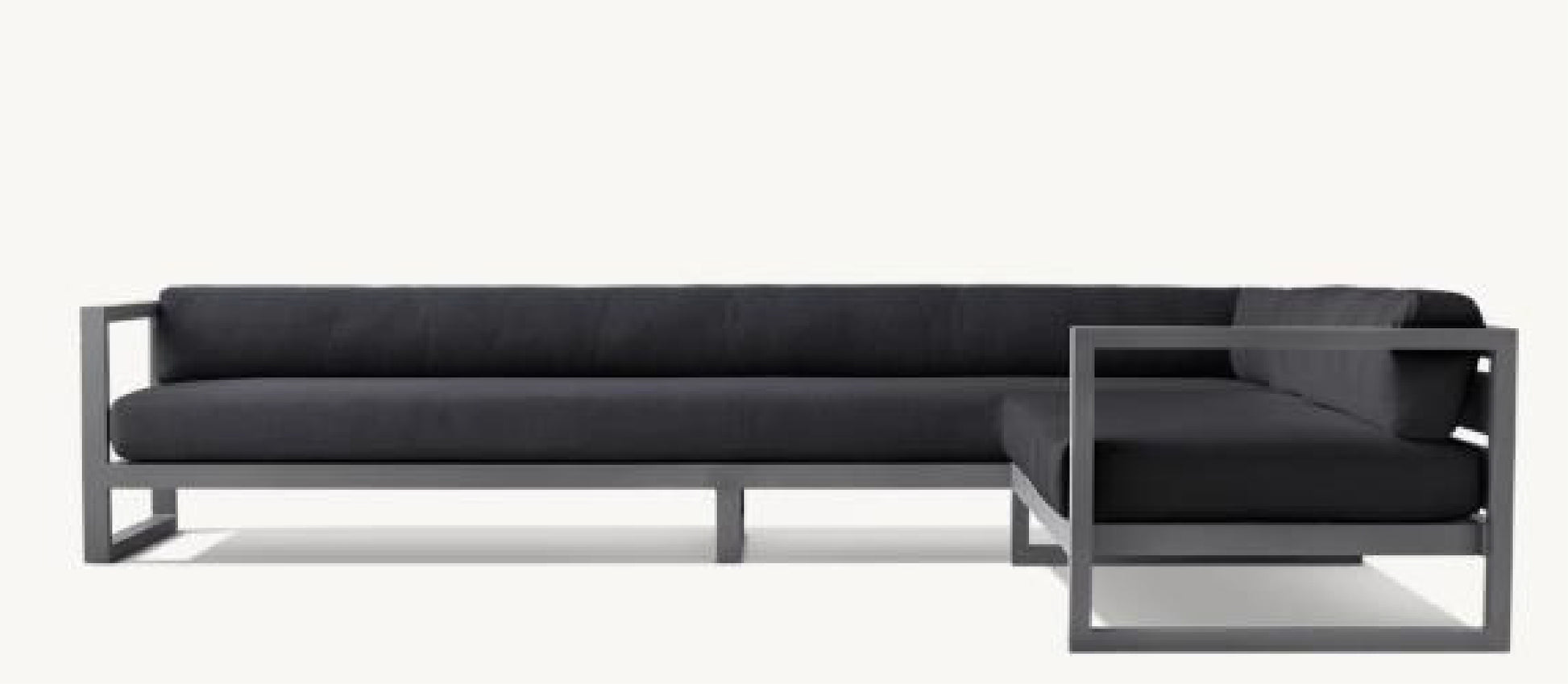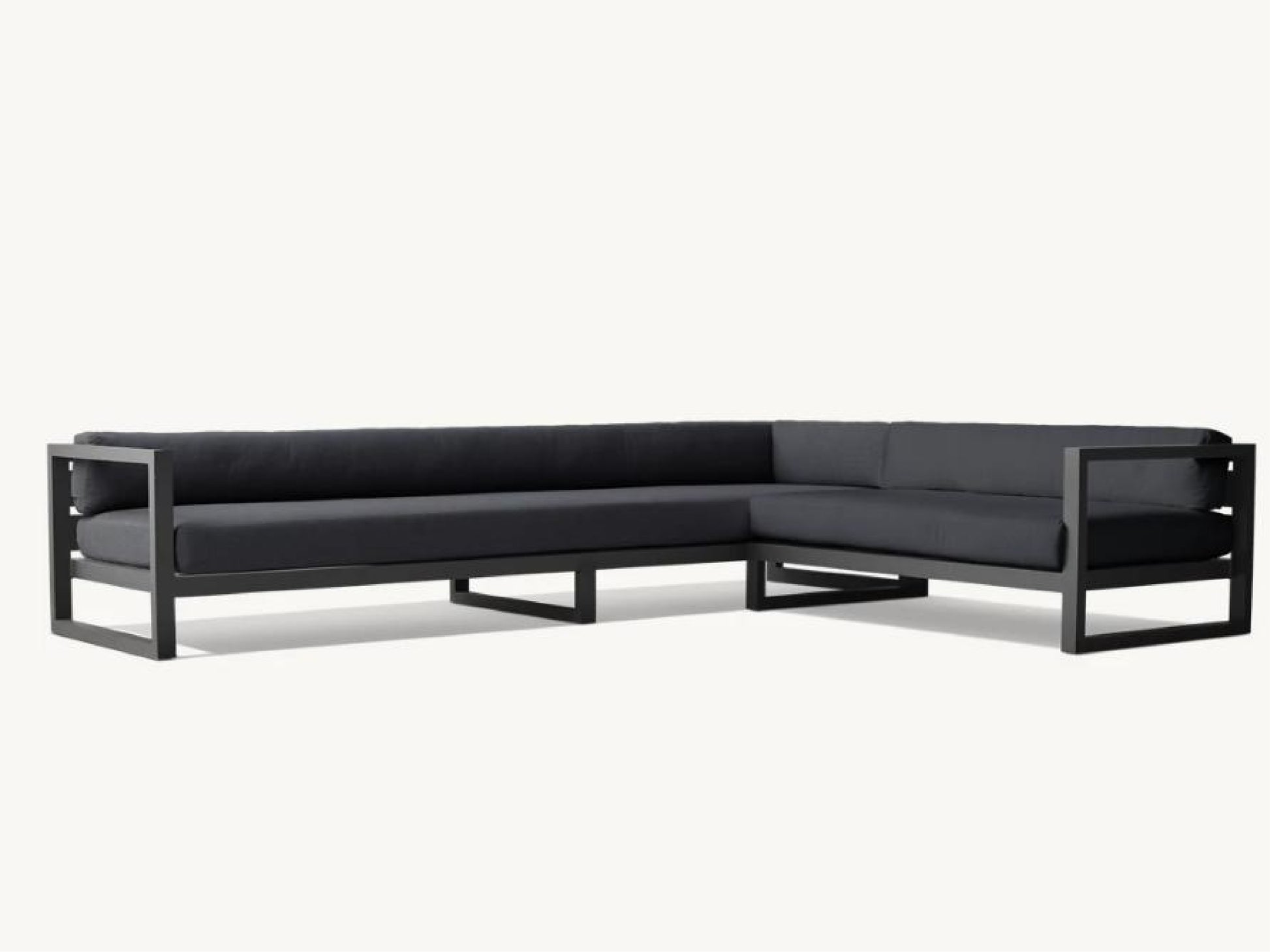 The Aeden Left/Right Arm Sofa features a sleek powder-coated aluminum frame with thick, charcoal-gray cushions, available in 2, 3, and 4-seat options. Its L-shaped design and minimalist open-frame structure offer versatile, modern seating for expansive outdoor lounging.