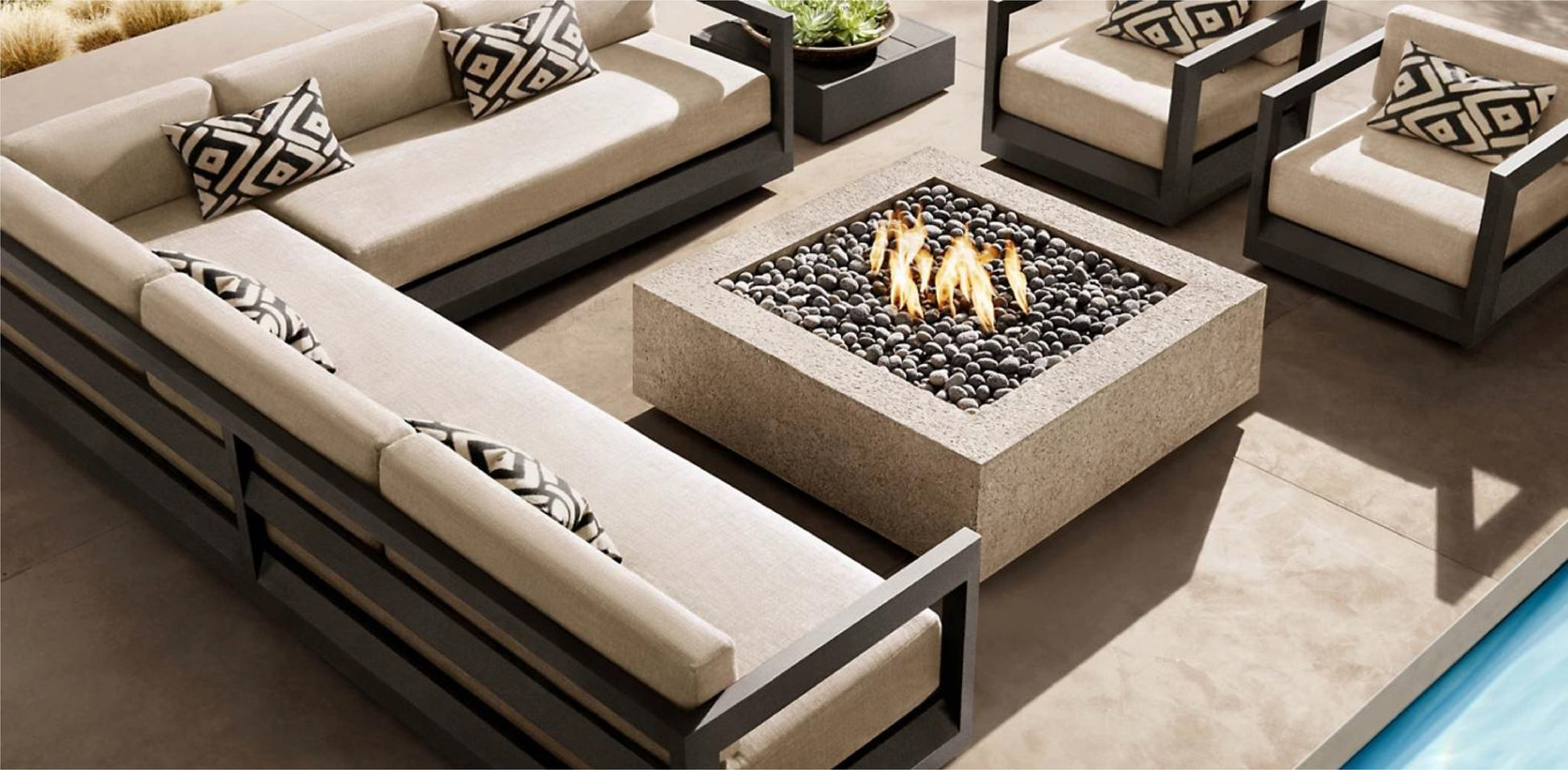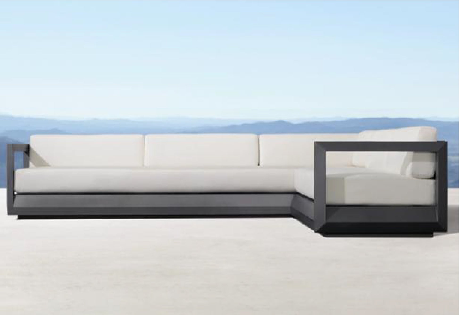 The Emerald Left/Right Arm Sofa blends sleek modernity with versatile comfort, featuring a sturdy dark powder-coated aluminum frame and plush, neutral cushions. Available in two-seat or four-seat return configurations, its L-shaped design offers flexible seating for intimate or expansive outdoor lounging.