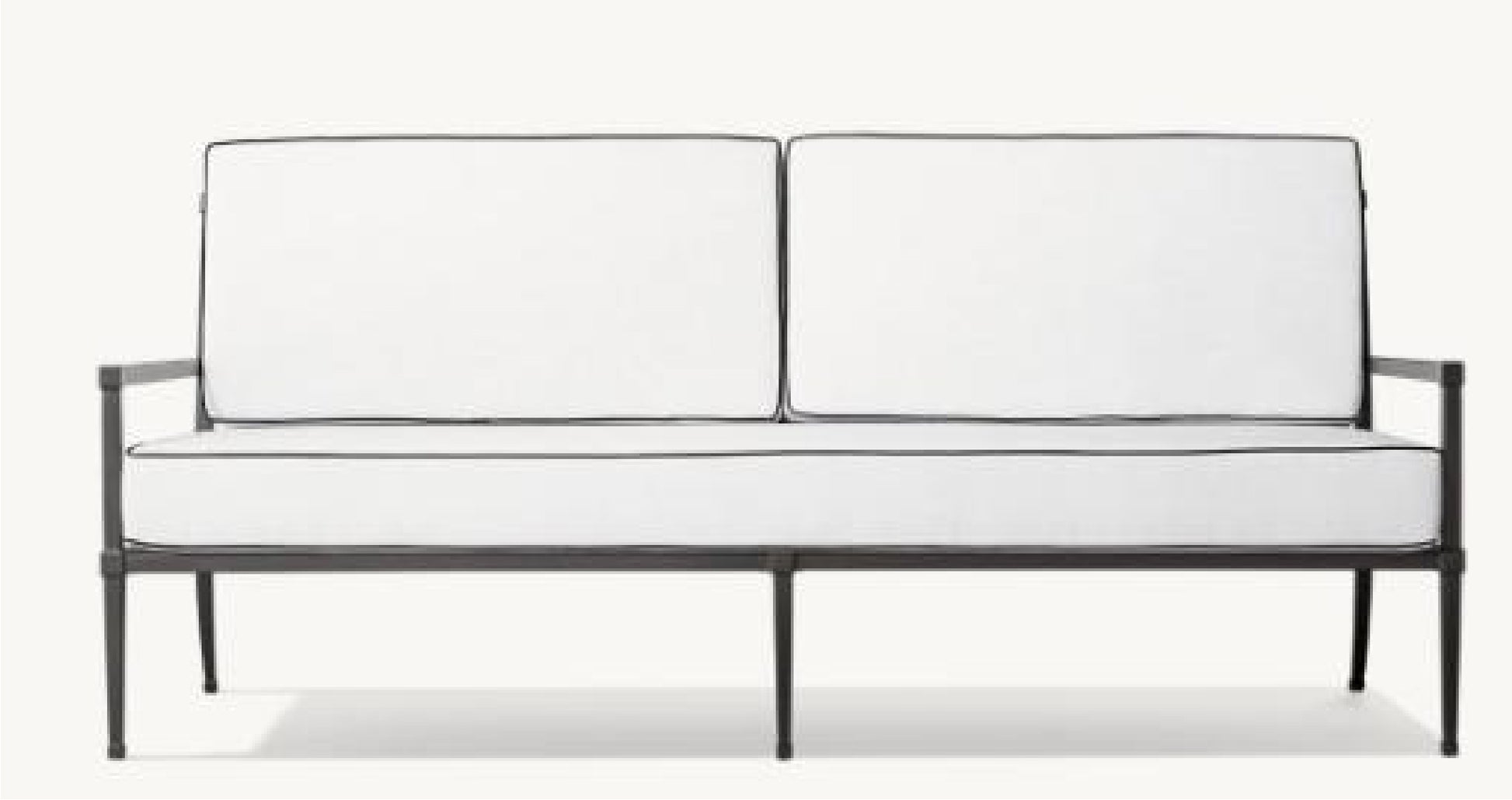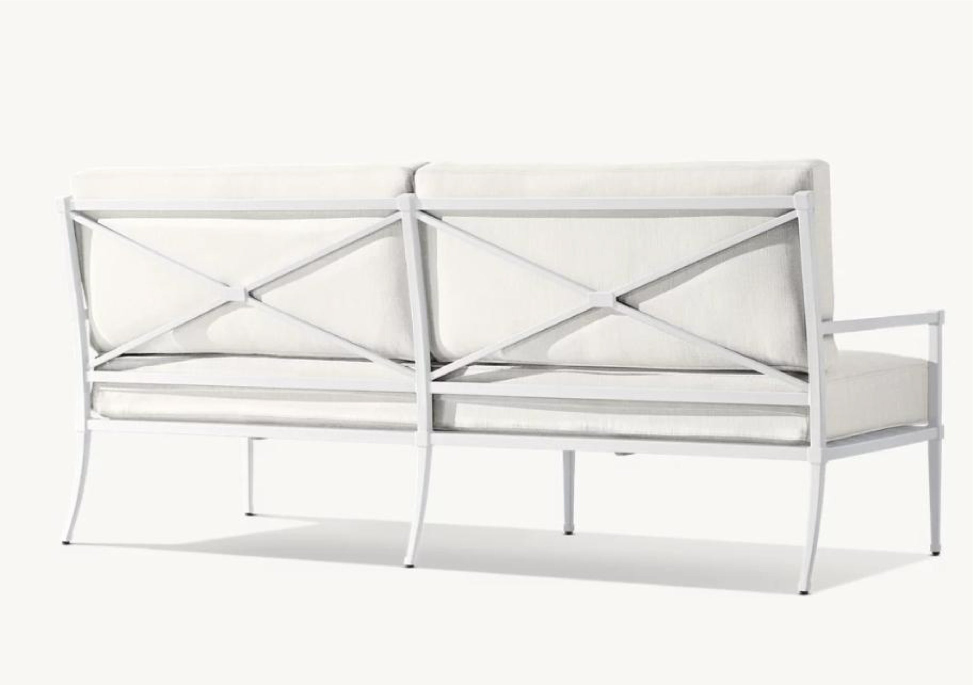The Tisdale Three-Seater Sofa brings timeless elegance to outdoor lounging. Its graceful aluminum frame is accented by an X-back detail and gently tapered legs, offering a classic silhouette with enduring charm. Crisp piped cushions provide tailored comfort, while the airy design makes it ideal for both traditional and transitional outdoor spaces.